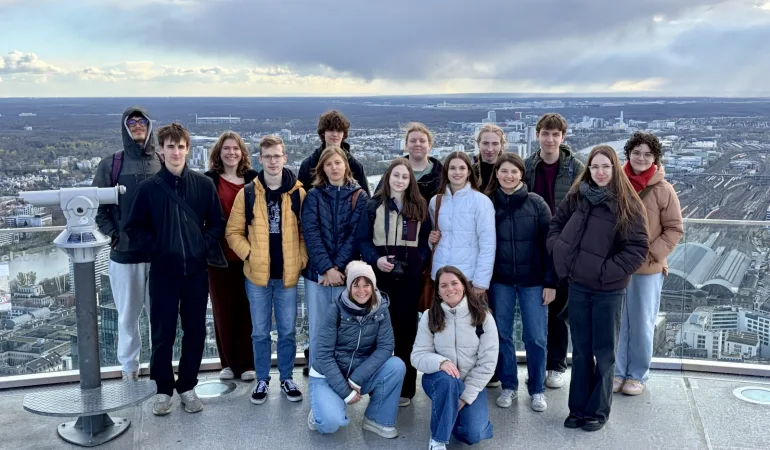 Na izmenjavo smo se dijaki 3. G odpravili v zadnjem tednu marca. Veselili smo se nove izkušnje, saj večina od nas še nikoli ni bila na šolski izmenjavi in nismo točno vedeli, kaj pričakovati. Ob prihodu v majhno nemško mesto Mayen so nas pričakali naši nemški pari in njihove družine, pri katerih smo bivali ves teden. Bivanje pri družinah je bila zelo zanimiva izkušnja, saj smo lahko od blizu spoznali njihov vsakdan, njihove navade in način življenja. Veliko časa smo preživeli skupaj – ob večerjah, pogovorih ali skupnih dejavnostih po šoli – in prav to nam je omogočilo, da smo se bolje spoznali ter spletli nova prijateljstva. Obiskali smo tudi njihovo šolo, kjer smo se udeležili nekaterih ur pouka in spoznali, kako poteka šolanje v Nemčiji. Poleg tega so za nas pripravili različne dejavnosti in delavnice. Med drugim smo se preizkusili v kuhanju, kjer smo skupaj pripravljali jedi, ter v ustvarjalnih dejavnostih, kot je slikanje. Takšne dejavnosti so bile zelo zabavne, saj smo lahko sodelovali z nemškimi dijaki in se ob tem tudi veliko pogovarjali v tujem jeziku. Z razredom smo se odpravili tudi na izlet v Koblenz. Mesto nas je navdušilo s svojo lepo staro arhitekturo in prijetnim vzdušjem. Posebej zanimiv je bil ogled znamenitega stika dveh rek – Rena (Rhein) in Mozela (Mosel), kjer smo naredili tudi veliko fotografij. Naslednji izlet je bil v Frankfurt, ki je popolnoma drugačen od manjšega Mayena, saj gre za veliko in zelo moderno mesto. Tam smo obiskali DFF – Deutsches Filminstitut & Filmmuseum (Muzej filma). Najprej smo si ogledali razstavo o zgodovini filma, nato pa smo sodelovali še v zanimivi delavnici. Spoznali smo nekaj osnov filmskega ustvarjanja, na primer kako nastanejo določeni filmski učinki in kako poteka snemanje. Delavnica je bila zelo zanimiva, saj smo se tudi sami preizkusili v igranju ter ustvarjanju z načinom Stop Motion in tako smo bolje razumeli, koliko dela je potrebnega za nastanek filma. Po ogledu muzeja smo imeli še nekaj prostega časa za raziskovanje Frankfurta, kjer smo si ogledali središče mesta, trgovine in znane mestne ulice. Zadnji dan izmenjave smo se skupaj z nemškim razredom odpravili še v Stuttgart. Tam smo obiskali Mercedes-Benz muzej, kjer smo si ogledali razvoj avtomobilov od prvih modelov do najnovejših vozil. Muzej je bil zelo zanimiv, saj je bil razstavljen velik del avtomobilske zgodovine in tehnološkega razvoja. Zadnji večer smo preživeli skupaj v središču mesta, kjer smo se še zadnjič družili, se pogovarjali in uživali v skupnem času. Izmenjava nam bo zagotovo ostala v zelo lepem spominu. Poleg zanimivih izletov in dejavnosti smo imeli priložnost spoznati novo kulturo, izboljšati znanje tujega jezika ter doživeti življenje v drugi državi. Najbolj dragoceno pa je bilo to, da smo spoznali veliko novih ljudi in spletli prijateljstva, ki bodo, upamo, trajala še dolgo po koncu izmenjave. Besedilo: Meta Lemut, 3.G