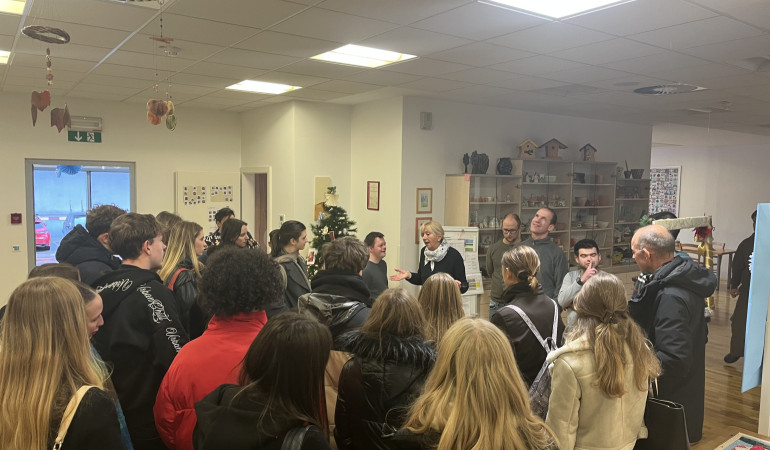 V sredo, 24.decembra, smo se dijakinje in dijaki 4.E odpravili na vsakoletni dobrodelni božični obisk. V štirih letih smo tako na pobudo svojega razrednika Francija Jakliča storili že štirikrat: v prvem letniku smo obiskali pediatrični oddelek UKC, v drugem letniku dom upokojencev Poljane, v tretjem letniku Kralje ulice, letos pa CUDV Draga. Na predbožični dan smo se tako družili z odraslimi z motnjami v duševnem razvoju v CUDV Draga, ki je za njih kot nekakšna služba. Razkazali so nam prostore in pokazali delavnice, ki jih imajo vsak dan. Sprejeli so nas z velikimi nasmehi in se z nami z veseljem podružili. Ob božični glasbi in piškotih, ki smo jim jih prinesli, smo se pogovarjali in celo doživeli koncert. Hitro smo ugotovili, da imamo v našem razredu in v njihovi druščini dva raperja, ki sta nam na licu mesta pripravila skupno pesem. Po eni uri smeha in plesa smo se v božinem duhu poslovili, vrata pa so ostala odprta vsakemu, ki si jih upa prestopiti, kot so nam sami povedali. Četudi smo bili na začetku prestrašeni in negotovi, kako se bo vse skupaj izšlo, je bil to najlepši obisk v celi srednji šoli. Pogovori so stekli sami od sebe in takoj smo se počutili prijetno, saj so nas sprejeli odprtih srca. S tem smo uspešno zaključili prvo polovico šolskega leta in pa tudi našo skupno božično tradicijo. Upamo, da bo to navdušilo še kakšen razred, saj so nasmehi in pogovori, ki smo jih doživeli ta štiri leta, nepozabna izkušnja. Besedilo in fotografije: Pika Črnič, 4.E