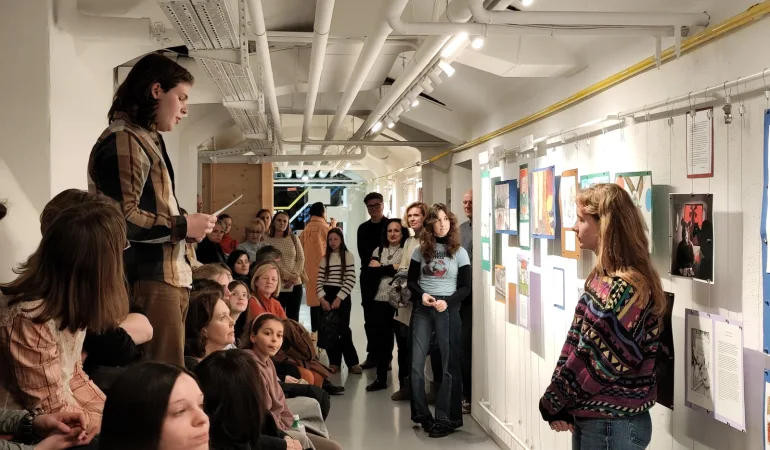V Galeriji G+ na Gimnaziji Poljane je 10. februarja 2026 zavladalo posebno vzdušje. Po hodnikih in razstavnih kotičkih galerije so se zbirali dijaki, profesorji in obiskovalci, ki jih je povezovala ista radovednost: kakšne zgodbe letos pripoveduje projekt Berideli? Pri projektu je letos sodelovalo okoli 40 dijakinj in dijakov, ki smo skozi branje in umetniško ustvarjanje soustvarili razstavo. Berideli na naši šoli že več let spodbuja bralno kulturo ter ustvarjalnost dijakinj in dijakov, saj knjigo postavlja kot izhodišče za osebni in umetniški izraz. Otvoritev že pete razstave tega umetniško-bralnega projekta je potekala ob branju odlomkov iz izbranih del in predstavitvi ustvarjalnih odzivov dijakov. Razstava je nosila skrivnosten, na novo izmišljen naslov Razpočnost – besedo, ki v sebi združuje idejo razpoke in močnega poka, trenutka, ko se nekaj prelomi in hkrati na novo poveže. Projekt na naši šoli temelji na preprosti, a zelo močni ideji: dijaki preberemo eno izmed ponujenih knjižnih del po lastni izbiri, nato pa nanj ustvarjalno odgovorimo v mediju, ki nam je najbližji. Tako knjiga ne ostane samo prebrana, ampak zaživi naprej – v umetnosti in v našem osebnem razmisleku. Priprave na letošnjo razstavo so se začele že novembra, ko smo segli po raznolikem naboru knjig: od romanov in spominov do družbenokritičnih del in poezije, kot so Živalska farma, Vegetarijanka, Kurja fizika, Konje krast, Živalska kmetija, Trpljenje mlade Hane, Bend, Dobra družba, Nekajkrat smo zašli, zdaj se vračamo in Vrnitev: Spomini Palestinke. Vsaka knjiga je odprla svoj svet in svojo razpoko, skozi katero smo lahko razmišljali o temah dobrega in slabega, preteklosti in sedanjosti, bližine in tujosti. Razpočnost kot naslov in osrednja ideja razstave izhaja iz besede razpoka. Ta predstavlja namišljeno mejo, ki jo lahko najdemo skoraj v vsaki zgodbi: med tem, kar je bilo, in tem, kar bo; med posameznikom in družbo; med »nami« in »njimi«. Berideli pa je prostor, kjer se te razpoke srečajo in trčijo ter ustvarijo pok – trenutek, ko se literarna zgodba prelije v umetniški izraz. Zato Razpočnost dobro opiše raznolikost in energijo projekta, kjer se literarni in umetniški svetovi združijo v skupni razstavni prostor. Ustvarjalni odzivi dijakov so bili letos zelo raznoliki. Med deli so obiskovalci lahko videli risbe, slike, fotografije in 3D-podobe, pa tudi kazalke za knjige, kratka filma z naslovoma Fressen macht frei ob romanu Živalska farma in Pelargonije, kot odziv na pesniško zbirko Nekajkrat smo zašli, zdaj se vračamo. Obiskovalci so si lahko ogledali tudi plesno miniaturo in glasbene točke. Nekateri so izbrano delo interpretirali z literarno refleksijo ali kamišibajem – japonsko obliko pripovedovanja zgodb ob slikah. Vsako delo pa je nosilo oseben pečat ustvarjalca in hkrati pokazalo, kako različno lahko bralci doživimo isto besedilo. Sama sem v procesu ustvarjanja za razstavo še posebej začutila, kako odprt in svoboden je ta projekt. Zdelo se mi je dragoceno, da sem lahko res ustvarjala po svoje, brez vnaprej določenih pravil, in da sem lahko občutja, ki jih je v meni odprla knjiga, izrazila na način, ki mi je najbližji in najljubši. Ta občutek ustvarjalne svobode in osebnega odziva je bil zame verjetno najlepši del celotnega procesa – trenutek, ko literarna izkušnja postane nekaj mojega, notranjega in čisto osebnega. Posebej me je pritegnil kamišibaj z naslovom Volk pogoltnik, ki je nastal kot odziv na Živalsko farmo. Najbolj mi je bilo všeč, da je bilo izvirno delo aktualizirano, prirejeno in ponovno pripovedovano skozi basen. Zgodba je tako dobila novo plast, hkrati pa ohranila svojo družbenokritično. Kamišibaj pa kot medij omogoča zelo neposreden stik s poslušalcem – pripovedovalec in podobe skupaj ustvarijo občutek žive zgodbe, skoraj kot bi se odvijala pred nami. Volk pogoltnik je zato deloval hkrati preprosto in zelo močno: skozi živalske like je spregovoril o oblasti, manipulaciji in človeških slabostih, a na način, ki je bil razumljiv, aktualen in tudi rahlo ironičen. Prav ta spoj basni in sodobnosti se mi je zdel najbolj prepričljiv in zabaven. Zelo me je nagovorilo tudi delo Razbito ogledalo, ki je nastalo ob romanu Vegetarijanka. Gre za 3D-sliko na platnu, ki človeka takoj pritegne in se ga dotakne. V ospredju je imitacija okostja glave, obdana z vrtnicami in razbitim ogledalom. Ogledalo ne odseva celote, ampak razdrobljene dele, zato gledalcu ponuja možnost samorefleksije – vsak lahko v njem vidi nekaj svojega, a nikoli popolnega. Delo tako združuje lepoto in nelagodje, krhkost in bolečino; podobno kot roman sam. Prav občutek notranje razklanosti in tihe praznine, ki jo nosi protagonistka iz Vegetarijanke, je v delu zelo močno prisoten. Tudi sama sem želela ob ustvarjanju svojega dela zajeti prav to praznino. Moje delo z naslovom Brez poudarja odsotnost – ne le odsotnosti oseb, temveč tudi odsotnost čustev, misli, morda celo samega sebe. Naslov sem izbrala zato, ker sem želela, da gledalec najprej začuti tišino, praznino, šele nato pa začne razmišljati, kaj pravzaprav manjka. Zdi se mi, da je prav občutek odsotnosti in notranje praznine na neki način povezovalna nit številnih knjig, po katerih smo ustvarjali. V različnih zgodbah se vedno znova pojavlja razpoka med tem, kar je človek navzven, in tem, kar doživlja znotraj – in prav to razpoko sem želela ujeti tudi sama. Otvoritev razstave je potekala ob branju odlomkov iz knjig in obiskovalce z njimi popeljali v izhodiščne zgodbe del, ki so bila preoblikovana v druge umetniške medije. Ob tem so predstavili tudi lastne ustvarjalne odzive, ki so nastajali več mesecev. Dogodek zato ni bil le razstava, ampak tudi srečanje bralcev, ustvarjalcev in poslušalcev – skupni trenutek, v katerem sta literatura in umetnost postali eno in skupaj povedali novo zgodbo. Po že petih razstavah se projekt Berideli na Gimnaziji Poljane ka