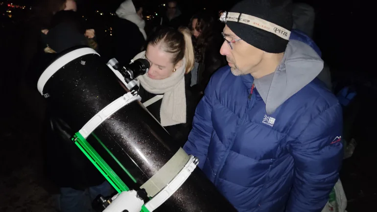 V sredo 22.11.2023 zvečer, smo se v jasni noči dijaki in profesorji Gimnazije Poljane zbrali na Ljubljanskem gradu, da bi opazovali Saturn, Jupiter in Luno. Kljub manjšim težavam s teleskopom smo uspešno opazovali. Najprej smo si ogledali Jupiter (na njem smo videli tudi dve progi) ter njegove lune Io, Kalisto, Ganimed in Evropo, ki so me najbolj fascinirale. Saturn je izgledal kot neka oddaljena kroglica z obročem, na Luni pa smo videli podrobnosti, kot so na primer kraterji in morja. Sprva se ti zdi, da na nebu vidiš le zvezdo, a kasneje ugotoviš, da je veliko več. Zanimivi so se mi zdeli tudi sateliti Elona Muska, ki smo jih videli na začetku, saj so se zelo hitro pomikali po nebu v ravni črti. To je bila res enkratna izkušnja. Vabim vas, da se nam pri naslednjem astronomskem opazovanju pridružite tudi vi. Kim Špehar, 2.E