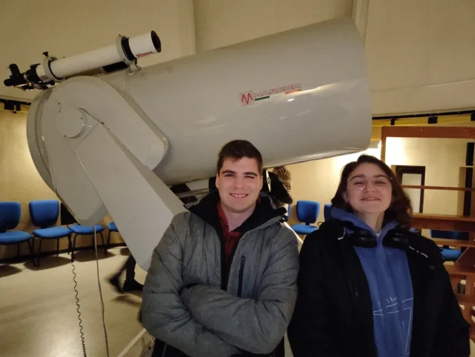 Rok Kovač, mentor krožka, in Katja Šimenc, ki je osvojila srebrno priznanje na državnem tekmovanju. Fotografirala Nada Žonta Kropivšek v Tržaškem astronomskem observatoriju pri Bazovici.
