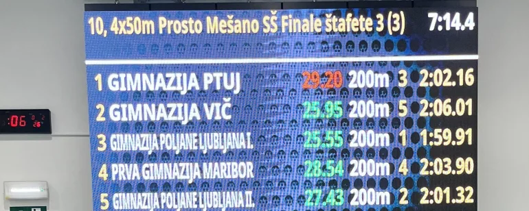 Naši dijaki in dijakinje so na državnem prvestvu v plavanju dosegli naslednje rezultate: ŠTAFETA GIMNAZIJE POLJANE 1 (Mark Frolov, Brina Rogelj, Nika Krenn Bukovec in Enej Mešič) - 1. MESTO ŠTAFETA GIMNAZIJA POLJANE 2 (Mark Milosavljevič, Ana Apat, Marta Arko in Tim Gregor Škulj) - 2. MESTO Mark Frolov - 1. MESTO neregistrirani plavalciMarta Arko - 5. MESTO registrirane plavalke Za dosežene rezultate čestitamo vsem tekmovalcem! Besedilo: Jan Jerebe, prof.