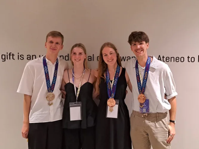 Mednarodna biološka olimpijada na Filipinih V času od 20. do 27. julija 2025 je na Filipinih potekala 36. mednarodna biološka olimpijada (IBO), na kateri je sodelovalo 297 tekmovalcev iz 77 držav. Slovenijo je zastopala štiričlanska ekipa, v kateri sta bili tudi naši dijakinji: Nika Bizilj (4. b) in Kaja Ciber (4. g). V močni mednarodni konkurenci je Nika Bizilj osvojila bronasto medaljo, Kaja Ciber pa je prejela pohvalo za dosežen rezultat. Obema dijakinjama za lep uspeh iskreno čestitamo in jima želimo še veliko dosežkov na nadaljnji poti.