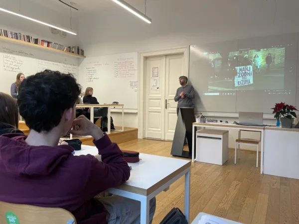 Na predavanju o Živalski farmi (19. januarja 2026) je profesor Miha Pohar analiziral manipulacijo v zgodovinskem in aktualnem kontekstu. Poudaril je ključno vlogo upora, protestov ter kritičnega razmišljanja pri doseganju družbenih sprememb. Tako sta na primer zavzemanje za pravice žensk ter boj proti suženjstvu in rasizmu, kljub preostalim neenakostim, vendarle izboljšala razmere. Z obljubami, olepševanjem in spretno manipulacijo si posameznik zlahka pridobi nadzor nad naivno množico ljudi. Predavanje, ki je bilo v prvi vrsti namenjeno letošnjim Cankarjevim tekmovalcem, je zbranim dijakom iz vseh letnikov, ki so napolnili učilnico 112, povedalo, kako pomembno je, da si upamo spregovoriti o družbenih napakah in vztrajati, čeprav morda sprva cilja ne bomo dosegli. Sama si bom tako zapomnila misel, da pasivnost omogoča zlorabo moči in vodi v razpad temeljnih vrednot družbe, saj molk odpira prostor krivicam in samovolji. Besedilo Jerca Prezelj, 2.C, fotografiji Darinka Marc