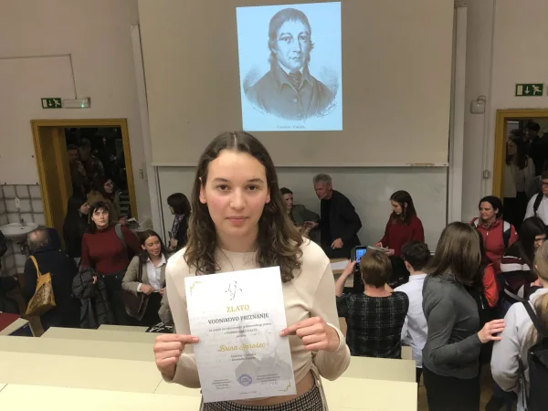 Letos je tekmovanje v znanju slovenskega jezika za Vodnikovo priznanje potekalo prvič, in sicer je bilo organizirano za osmošolce in dijake 3. letnikov srednjih šol. Naša dijakinja Brina Korošec, 3. H je na državni ravni dosegla 2. mesto in je tako med prvimi dobitniki zlatega Vodnikovega priznanja. Podeljenih je bilo sedem zlatih priznanj, na državno raven se je sicer uvrstilo 71 tretješolcev iz gimnazijskih programov iz vse Slovenije. Brini iskreno čestitamo! Besedilo: Darinka Marc
