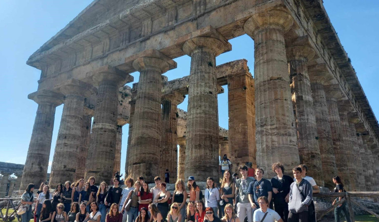 Iz hladne in turobne Ljubljane smo po dolgem, a vznemirljivem popotovanju pod zvezdami pripotovali v živobarvne, s soncem obsijane Pompeje. Ko smo se naspani in sveži prebudili, smo polni radovednosti stopili med ostanke tega skoraj čudežno ohranjenega starodavnega mesta. Kakor bi stopili v drug čas, smo se sprehajali po tlakovanih ulicah, ki so še vedno nosile znamenito pompejansko rdečo, se čudili skrbno izdelanim eksponatom ter začutili utrip davnega življenja prebivalcev, katerih spomini so ujeti v kamnu in barvi. Od tam nas je pot zanesla v neugnani Neapelj, obljubljeno deželo bučnega vrveža in drznega duha. Nastanili smo se v hotelu, nato pa, komaj ukročeni, pohiteli raziskovat starodavno, a vedno živahno mesto. Neapeljski utrip je divji in nebrzdan; stereotipni italijanski vozniki drvijo po cestah, kot da jim prometni zakoni niso predpisani, ne ozirajoč se na radovedno gručo slovenskih dijakov so hiteli v nov dan. A svoj nebrzdani prometni vrvež so kmalu omilili z vabljivim vonjem sveže pečene napolitanske pice in omamno aromo kave, cenovno dostopne tudi v domačinom namenjenih gostilnah. Do večera smo raziskovali skrite kotičke, kjer so se med svetlobami uličnih svetilk počasi prebudile tudi skrivnosti neapeljskega nočnega življenja. Izmučeni, a polni vtisov, smo večer sklenili z druženjem v domačnosti hotelskih sob. Nedeljsko jutro nas je po hotelskem zajtrku povabilo na podeželje, kjer smo obiskali kmetijo in v družbi prijaznih domačinov spoznali umetnost priprave sveže mocarele, katere bogat okus in kremasta tekstura sta pustila globok pečat. S povsem prebujenimi čuti smo pot nadaljevali proti Paestumu, eni najstarejših kulturnih zakladnic, kjer smo po lepo urejenih stezicah občudovali antične grške in rimske templje, veličastne ostanke preteklosti. V tamkajšnjem muzeju smo uzrli najnovejše najdbe, ki razkrivajo drobce starodavne zgodovine in nam omogočajo vpogled v vsakdanje življenje tistih, ki so tod nekoč živeli. A naše klasično hrepenenje po zgodovini še ni bilo potešeno, zato smo popoldne posvetili Herkulaneumu, mestu, ki ga je usoda vezala na uničujoč izbruh Vezuva, prav tako kot Pompeje. Ulice tega zamrznjenega časa, ki jih je oživljal navdušen vodič, so nas popeljale v svet, ki ga zlahka občutiš, a težko pozabiš. Večer nas je spet pripeljal nazaj v Neapelj, kjer smo se s praznimi želodci, a polnimi srci predali italijanski kulinariki in svobodnemu raziskovanju mestnih biserov. Ponedeljkovo jutro nas je pričakalo z zadnjo jutranjo kavo in veličastnim vzhodom sonca. Pot iz hotela nas je vodila v Narodni arheološki muzej, kjer smo lahko občudovali bogato zbirko antičnih predmetov, najimenitnejšo na svetu. Z očmi nahranjenimi z umetnostjo in radostjo, da smo doživeli del preteklosti na tako izjemen način, smo se počasi poslovili od neapeljskih ulic, čeprav naše poti še ni bilo konec. Preden smo zaključili ekskurzijo, smo obiskali še Caserto, kjer smo v mogočnosti Kraljeve palače začutili dih razkošja, ki se zdi kakor italijanski Versailles. Čeprav nas vsakdanje življenje ne obdaja z bliščem in zlatom, kot ga imajo ti zidovi, smo domov prinesli nekaj dragocenega – nova prijateljstva, bogatejše razumevanje antičnega sveta in spomine, ki nas bodo greli v hladnih zimskih večerih. Ljubljana nas je ob vrnitvi pričakala s hladnim objemom, a mi smo ji prinesli nekaj sonca – toplino doživetij in spoznanje, kaj je prava kava. Besedil: Luka More, 3.a
