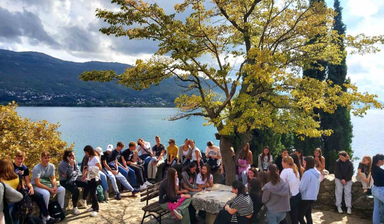 Reportaža prvega dela mednarodne izmenjave 3.G z Gimnazijo Orce Nikolov, Skopje (3.– 10. oktober) Po dveh letih pridnega žvečenja nemških glagolov in prekuhavanja primerne priloge artiklov,je nam (sedaj že ponosno izurjenemu nemškemu razredu) mednarodna izmenjava postregla s povsem nenavadno izkušnjo. S pričakovane palete rumene, rdeče in črne smo postrgali le prvi dve barvi ter se iz sive Ljubljane preslikali v sončno Severno Makedonijo. Tam smo poleg abecede novih okusov prav tako uspeli zaužiti nekaj grižljajev cirilice. Komaj smo se privadili neutrudnega šolskega zvonca, že so nas noge odnesle drugam. Tretjega oktobra, kar sredi tedna, smo namreč že pridno tovorili kovčke (in zvezke), po šolskih hodnikih. S takšno povorko smo zagotovo predstavljali kar zanimivo atrakcijo za ta deževni, skoraj običajni, a vseeno poljanski četrtek. Kljub sprva množični zaskrbljenosti glede omejene teže prtljage smo bili po prekladanju našega tovora vse do drugega nadstropja kar malo hvaležni za te zahteve. V dežju smo se za en teden poslovili od Slovenije ter se po krajšem letu, začinjenim z ravno pravšnjo mero spanca, znašli na makedonskih tleh. Oblak živčnosti, ki se je nakopičil nad zmedenimi poljanci, je kmalu pregnal topel pozdrav naših gostiteljev, ki so nas odprtih rok (nekateri so se sicer oklepali table za dobrodošlico), že čakali na skopskem letališču. Saj smo pričakovali toplo dobrodošlico, med drugim v obliki polnjenih paprik, pastrmajlij in drugih tradicionalnih jedi, pa vendar so nas družine presenetile s svojo odprtostjo in gostoljubnostjo. Večer je za večino že pomenil izlet v mesto, kjer smo spoznali, kako je, če so vsi lokali ves teden odprti in polni do polnoči. Prvi delovni dan na šoli naših makedonskih vrstnikov je bil, kot nalašč, prav petek. Do Gimnazije Orce Nikolov v centru Skopja smo pripotovali z nekolikanj nezanesljivimi, a presenetljivo grajenimi avtobusi. Ob pogledu na ta rdeča dvonadstropna prevozna sredstva bi domišljija marsikoga popeljala do ulic Londona, medtem ko je nas le varno dostavila do šole čez jutranje razpoloženo mesto, polno zastojev. Ko so nas uradno (a z nič manj osebne note) pozdravile še profesorice gostujoče šole, so nastopile predstavitve držav. Naučili so nas marsikaj o tamkajšnji kulturi in zgodovini, Skopju kot prestolnici in nenazadnje njihovi gimnaziji. Tudi sami smo jim predstavili koščke Slovenije – vsaj tolikšen delež, kot smo ga lahko vzeli s seboj na letalo. Po odmoru, večinoma za kavo, na katero gredo Makedonci obvezno večkrat na dan, smo se za nekaj ur pridružili ostalim učencem pri pouku. Presenečeni smo bili nad drugačno dinamiko pouka, kot smo je vajeni na Poljanah pa tudi nad tako velikim zanimanjem tamkajšnjih učencev za študij v Sloveniji in drugod v tujini. Dežne kaplje so se poigrale s predvidenim urnikom in tako smo ogled prestolnice preložili na prihodnji teden. Puste barve oblakov pa so le oplazile okna učilnic, v katerih smo mi pričeli z mešanjem odtenkov naše makedonsko-slovenske umetnine. V manjših skupinah smo strnjenih glav sestavljali delčke kolaža z različnih področij. Počasi so se zarisale glasbene note, razprli smo zemljevide, zadišalo je po zgodbah iz preteklosti in zaškripale so odrske deske. Za češnjo na torti pa smo iskrive trenutke vsakega dne ujeli še na filmski trak. Počasi smo se privadili sproščenega pogovora ob kavi, ki se rade volje spontano zavleče do poznih ur. Kljub temu pa smo v deželi pod zlatim soncem soboto pozdravili z mislijo na pregovor, da je rana ura zares zlata. Čas je že bil, da spoznamo tudi zelene gozdove, neskončna polja in slikovita naravna bogastva Severne Makedonije. Po nekajurni vožnji, še malenkost bolj na jug, so se naši pogledi končno srečali z veličastnim Ohridskim jezerom. Ta je nedvomno obvezen postanek za vsakega obiskovalca države. Obkrožili smo staro mestno jedro, skrito za mogočnim obzidjem, ter se povzpeli vse do amfiteatra. Mestece, v katerem počitnikuje mnogo Makedoncev, naj bi po besedah naših tamkajšnjih vrstnikov zares zaživelo šele poleti. Pa vendar je nas tudi na ta dan očaralo s svojo karizmo in arhitekturo. Stopili smo v le nekaj od mnogih ohridskih cerkva, kraj namreč slovi po kar trimestnem številu le-teh, z eno cerkvijo za vsak dan v letu. Naj bo to prestopno ali ne, naj matematika tokrat ne bo na prvem mestu. Nepričakovano poletno razpoloženo vreme z visokimi temperaturami nas je navdalo z mislijo na kopanje v prijetno topli vodi, čeprav Makedonci niso bili enakega mišljenja. A nismo imeli ne kopalk ne časa za razmislek, pot nas je namreč že vodila naprej. Naša zadnja sobotna postojanka je bila Bitola, manjši kraj, ugnezden precej blizu svoje južne sosede. To smo, na žalost, spoznali le v lastni režiji, večina s kratkim sprehodom skozi mestece. Morda pa gre vendarle za srečo, saj to pomeni, da se bo potrebno še enkrat vrniti, da jo raziščemo. Sledila je še večerna vožnja nazaj v Skopje, ki pa je kljub dolžini, ob glasni balkanski glasbi, zahvaljujoč našim gostiteljem minila hitreje kot bi sicer. Nedelja je bila za nekatere bolj delovna kot za druge. Dan je namreč vsak od nas preživel na drug način, z družino svojih gostiteljev. Seveda se mnogi nismo branili malo daljšega spanca, spet drugi so bili na nogah že zgodaj. Prvi smo v veliki večini ostali kar v prestolnici ter se zaposlili z raziskovanjem starega bazarja, se z žičnico odpravili na hrib nad mestom ali slučajno postali eni od redkih opazovalcev maratona. Mnogi so prestopili prag živalskega vrta, drugi so se razkropili po državi. Ena spremenljivka pa je kljub raznolikim variacijam dneva pri vseh ostala enaka. Prav nihče ni zaspal s krulečim želodcem, saj smo se, kot tudi vsak dan poprej, hvaležno (pre)najedli neštetih makedonskih dobrot. Ker nismo prenesli misli na običajen ponedeljek, smo ob pričetku novega tedna pobegnili do kanjona Matka na o