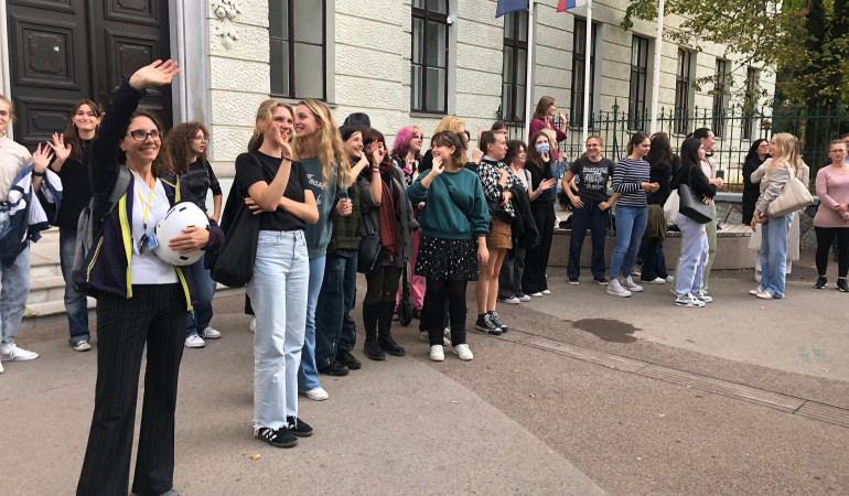 Oktobrski sončni teden za 3.A in francoske goste iz gimnazije Balzac v Toursu V sredo, 4. oktobra, smo pred šolo nestrpno pričakovali neznane potnike, ki so se z vsako minuto približevali jesenski Ljubljani. Čakal nas je pester teden, poln nerazumljenih francoskih fraz, potovanj po Sloveniji in izven, druženja z že znanimi in novimi obrazi. Ko so francoski gostje že spoznali naše družine in domove, jih je čakalo spoznavanje naše šole in Ljubljane. A na dobro poznano okolje smo tudi mi gledali z drugačnimi očmi, zdaj ko smo imeli par novih ob sebi. Da bi postali tujci drug drugemu domači, je bila naslednji dan organizirana spoznavna zabava. Po dnevu, ki smo ga preživeli v tržaški Rižarni in Postojnski jami, smo se zopet srečali na Špici. Dan se je torej končal (ali noč začela) v zvokih francoskega rapa, kitare in smeha. No, nekateri pa so se razveselili šele naslednji dan. Oddih od svojih na novo pridobljenih bremen so končno dobili ob slapu Slavici, ko smo se nenačrtovano ločili in nato zopet našli ob Bohinjskem jezeru, kjer so nekatere čakali sendviči, druge skok v mrzlo vodo. Naslednjega dne so se nekateri držali naslova in dan preživeli z družino, drugi smo s svojimi pari šli po svoje, vsi pa smo se v ponedeljek odpeljali v Idrijo, se spustili pod zemljo. Ko smo še istega dne ob pol petih zapustili Prirodoslovni muzej, je bilo v zraku že čutiti, da se slovenski del izmenjave približuje koncu. Slovo smo si na pol že izrekli na Špici ob osmih zvečer (ob francoskem rapu, kitari in smehu), a pred nami je bil še en dan. V torek smo se vsi vrnili šolske učilnice, v katerih so Francozi doživeli slovenski pouk, nato pa smo še zadnjič imeli delavnice. Te, razporejene sicer skozi cel teden, so se sklenile v zaključni prireditvi. Na odru so se zvrstile različne točke, od predstave o Postojnski jami do petja partizanskih pesmi. Kot da bi se prestavili en teden nazaj, smo kar naenkrat zopet stali pred avtobusom, obdani s kovčki, objokanih ali nasmejanih obrazov. Francoski avtobus se je odpeljal, dijakinje in dijaki 3. A pa smo ostali na mestu ter z nasmehom gledali naprej, nekateri na oddaljeni drugi del izmenjave, drugi pa so občutili predvsem razbremenitev po intenzivni skrbi za gosta, a hkrati tudi novo samozavest, vzniklo ob pridobljenih izkušnjah, ki so izšle iz te iste skrbi.