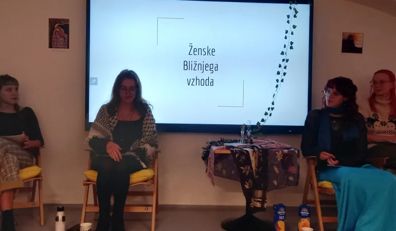 V četrtek, 20. 11. 2025, smo na gimnaziji Poljane v prostorih G+ organizirali literarni večer na temo Ženske bližnjega vzhoda. Z njim smo želeli izpostaviti pesnice in avtorice iz držav zahodne Azije, Arabskega polotoka in severne Afrike, da bi enkrat za spremembo slišali še njihov glas in ne samo besede drugih. Poleg branja poezije in proze, razstavljanja znanih slik bližnjevzhodnih umetnic, in pogostitve ob koncu večera, smo na šolo povabili tudi gostjo Saro Afzali, iransko pesnico, ki živi v Sloveniji. V pogovoru z njo smo slišali marsikaj o življenju žensk v Iranu in njenem osebnem odnosu do poezije, slišali pa smo jo tudi brati svojo poezijo v perzijščini. Na literarnem večeru smo sodelovale Tanja Moe, Alina Andronnikova, Dunja Velebit, Marina Mihajlović in Ajda Laban.Besedilo: Tanja Moe, 4. a