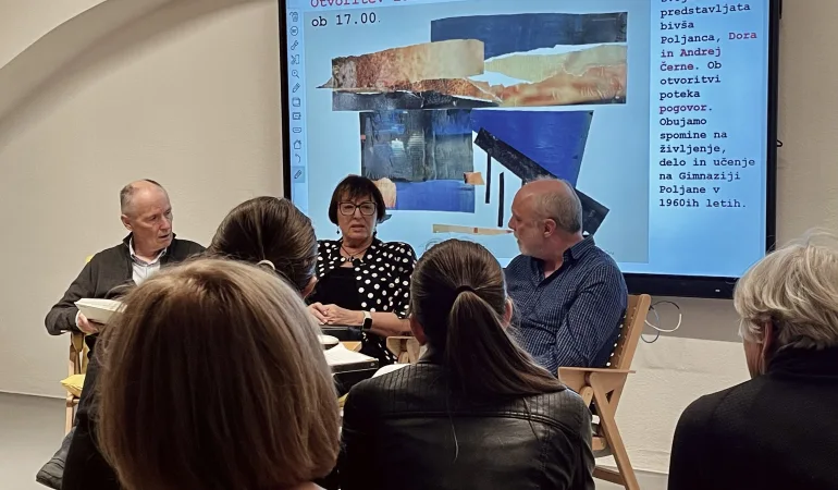 Potopljena v globine in neskončne črnine oceana se pod nogami poljanskega vsakdana skriva galerija G+ s svojo barvito paleto razstav, ki živijo in prostore oživijo danes bolj kot kdajkoli prej. Kotiček, ki ga smo še pred kratkim poznali pod igrivim imenom Podmornica, je v minulih letih gostil že marsikatero obliko umetnosti. Otvoritev razstave Dore in Andreja Černeta, pa je obiskovalce v minulih jesensko obarvanih dneh popeljala v modrine časov, ko so med širšo javnostjo odzvanjale melodije o rumeni podmornici. S prihajajočim letom mineva dvajset let od pričetka njune slikarske poti, katere začetki segajo v leto 2006, ko sta privič obiskala Slikarski atelje akademske slikarke mag. Barbare Kastelec, kjer kot ljubiteljska slikarja ustvarjata še danes. Plovbo skozi morje mnogih raznolikih razstavljenih del so otvorili ravnatelj z uvodnim govorom, Nina Ostan z napovedjo obeh umetnikov ter eden od le-teh, Andrej Černe z nekaj besedami o osnutkih in samemu razcvetu ideje o razstavi. Ta je namreč obrodila sadove s pomočjo njune prijateljice, ki je svojo srečo poskusila pri ravnatelju naše gimazije, veter pa je v jadra zapihal, ko sta se umetnika povezala s profesorico Nino Ostan. Pisana platna so se zasidrala v pristanu galerije s pomočjo našega dobrosrčnega hišnika, Dorina in Andrejeva vnukinja pa je na otvoritvi poskrbela za barvito vzdušje z melodijami, ki jih je izvabila izpod črno-belih klavirskih tipk. Že ob vstopu v galerijo, zasidrano globoko pod razvejano šolsko stavbo, obiskovalca pozdravi večplasten nabor likovnih del. Prav vsako izmed njih naše oči nagovori v svoji govorici, katerihe sleherni ton k celotni sliki in izkušnji prispeva svoj košček kolaža pisanih občutij. Pozdravijo nas igrivi kolaži, odločnost gvaša se sreča z nežnimi akvareli, svojo zgodbo nam nam uho prišepnejo pasteli, s svojo globino in modrostjo nas tiho nagovori olje na platnu ter nas opozori na dinamičnost ter neposrednost sodobnosti akrilnih barv. Razstavljena dela sestavljajo edinstveno zgodbo, s katero nas Dora in Anderj popeljeta čez razburkano morje neštetih odtenkov, iger svetlobe in barv v socvetju z njuno domišljijo. Valovito gladino zbranih obiskovalcev razstave so sestavljali njuni vrstniki, s svojimi spomini na šolska leta oziroma leta pod okriljem poljanske gimnazije. Ti so se mešali z odtenki mlajših generacij, med stenami, ki so kljub sodobnemu pridihu odigrale vlogo kot lasten delček zgodovine. Ob dinamičnem pogovoru umetnikov s profesorjem Markom Trobevškom je tudi zbrana družba sama postala mozaik življenjskih zgodb, rdečih niti, ki nas prepletajo, ter medgeneracijskih razlik, katerih odsevi lahko v nas obudijo občutja in spomine v barvah od rdečega neba pa vse do modrin morja; sestavijo mozaik — od kolaža do olja. Besedilo in fotografije Neja Brumen, 4.G