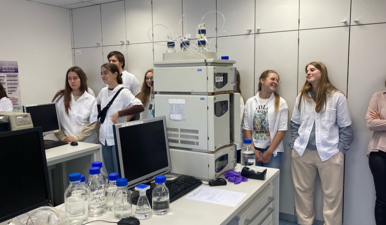 Z manjšo skupino dijakov in dijakinj izbirnih oddelkov kemije smo si 5. 6. popoldne ogledali dva izmed mnogih delov tega raziskovalnega "paradnega konja" Slovenije: in sicer biokemijski del in del, ki se ukvarja s prehrano. Na kratko so nam prikazali svoje delo in tisto, saj veste - raziskovalno strast, ki je je kar kipela iz predstavitve ... Sami smo poskusili pipetirati z avtomatskimi pipetami, kromatografirali barvilo špinače in na koncu bili nagrajeni z nekaj publikacijami. Kar je vredno omembe - srečali smo tudi nekaj bivših poljancev oz. poljank, ki kot mladi raziskovalci hodijo po poti do doktoratov in naprej. Igor Kavčič, prof.