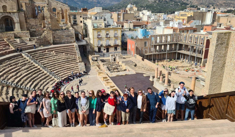 Ko so bile temperature v Ljubljani ravno pravšnje, da smo pospravili tople bunde, smo dijaki 3. B z navdušenjem spremljali vremenske obete za južni del Španije, saj smo 22. marca iz Trsta odleteli na drugi del naše izmenjave. Od pristanka v Valenciji nas je do srečanja s španskimi vrstniki ločilo le še nekaj sto kilometrov. Po našem mnenju smo v Alcantarillo, manjše mesto, ki se ga je med nami prijelo ime »španske Domžale«, prispeli precej pozno, po španskem ritmu pa nalašč za večerjo. Po napornem potovanju smo lačno degustirali lokalne specialitete: marinera, croquetas, tortilla de patatas, paparajote (gre za liste limonovca v testu, ki je posut s sladkorjem in cimetom – odločitev, ali list pojesti, je prepuščena vam) in seveda jamón, nato pa utrujeno padli v postelje. Vremenska napoved se ni zmotila: zbudili smo se v toplo jutro in res oblekli poletna oblačila. Po prihodu na CES Samaniego smo bili deležni toplega sprejema, saj nas je neučakano pričakovala celotna šola. Presenetilo nas je njihovo zanimanje za goste in sproščenost, s katero so se nam približali učenci vseh starosti. Povsem drugačen vtis je dajala šolska zgradba – rešetk na oknih, zidu okrog šole in sirene namesto šolskega zvonca poljanci namreč nismo vajeni. Niti med šolskim odmorom učenci ne smejo zapustiti šole, zato smo na dvorišču malicali sendviče, ki so nam jih zjutraj skrbno pripravili naši španski starši. Nato smo se preizkusili v tradicionalnih španskih športih, za katere smo ocenili, da so pravzaprav slovenski, a kot vljudni gosti nismo želeli sprožiti prepira. Po pouku smo se družili ob tapas in obiskali etnološki muzej. Večer smo preživeli z gostitelji vsak po svoje – skupni imenovalec je bil le to, da nihče ni večerjal pred deseto.