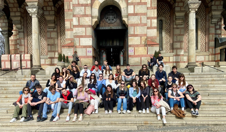 Po dobrih štirih mesecih, odkar smo gostili naše srbske vrstnike, je napočil čas, da za teden dni zapustimo lagodje svojega vsakdana in poletimo v Beograd. V nedeljo 20. marca smo v jutranjih urah pristali na beograjskem letališču, kjer so nas nestrpno pričakali naši srbski prijatelji in hitro smo se razpršili po srbski prestolnici. Pot nas je povedla na vse konce; od stolpnic Novega Beograda, skozi staro mestno jedro pa do stanovanjskih obrobji mesta. Že isti večer pa smo se zbrali iz naših kotičkov širnega mesta in prvič (ne pa tudi zadnjič) izkusili delček burnega nočnega življenja, po katerem slovi Beograd. V ponedeljek so nam srbski vrstniki pripravili sprejem v šoli s kratkim kvizom o Sloveniji in Srbiji, v katerem smo ponovili znanje o naši domovini in se podučili o zanimivostih Srbije. Sledila je učna ura cirilice in zabavnih srbskih frazemov, красно! V prihodnjih dneh smo si ogledali neštete znamenitosti mesta. Občudovali smo prečudovit Hram sv. Sava, se sprehodili po ulici kneza Mihaila, se povzpeli na trdnjavo Kalemegdan in se usedli v veličasten srbski parlament. V torek smo se s sodobnim hitrim vlakom odpravili v Novi Sad. Po ogledu zgodovinskega mesta smo obiskali mestni muzej z umetniško razstavo, ki pripoveduje žalostno življenjsko zgodbo Mileve Einstein, žene slavnega znanstvenika, rojene v Novem sadu. Športni dan smo začeli z ogledom muzeja Jugoslavije s Titovim grobom (nekateri smo na ogled zamujali, vendar se tokrat, tako kot naši gostitelj, nismo obremenjevali s točnostjo). Preostanek dneva pa smo preživeli na Adi Ciganliji, beograjski plaži z urejenimi športnimi igrišči, kjer se lahko v poletnih mesecih ohladiš s skokom v Savo. V četrtek smo na Gimnaziji Sv. Sava opazovali pouku, ki je v osnovi potekal precej podobno kot pri nas. Pokazali smo tudi svojo umetniško žilico, saj smo skupaj s svojimi srbskimi partnerji ustvarili spodbudne napise in sestavili pesem oz. zgodbico z naključnimi slovenskimi in srbskimi besedami. Pomanjkanje toaletnega papirja na straniščih in nekolikšna zastarelost šole sta nam vzbudila nekaj domotožja, vendar se je le to, ob pogledu na simpatično poslikano knjižnico, polno zelenja in prijetnem vzdušju, hitro izgubilo. Tudi prijazne potepuške mačke, ki se potikajo okoli šole, so bile dobrodošlo razvedrilo. V petek smo za starše pripravili predstavo, ki je podelila naše izkušnje z izmenjave. Tokrat smo prisluhnili Magnificovem Tivoliju in Zemlji Ekatarine Velike ter recitiranju slovenske in srbske poezije. Beograjčani so se nas lotili s šaljivimi skeči, ki pa smo se jim vsi nasmejali. Za konec smo zaploskali izvrstni gledališki predstavi naših in srbskih dijakov in filmu z utrinki z izmenjave. Zadnji dan v Beogradu smo preživeli z družinami, vsak po svoje. Nekaj nas je obiskalo predel mesta Zemon, nekateri so si ogledali živalski vrt …Tudi zadnji večer smo doživeli različno. Tisti najbolj neukrotljivih so zadnjo noč prebedeli, kot se v Beogradu spodobi ;), nekateri smo zvečer prisluhni glasbi v živo v tradicionalni kafani ob najboljših čevapčičih, spet tretje pa je premamil spanec. Ko smo septembra izvedeli, da bomo imeli izmenjavo s Srbijo in ne z Nemčijo, je bilo v razredu čutiti razočaranje, ampak iskreno mislim, da bi si bilo boljšo izmenjavo težko zamisliti. Beograjčani so nas sprejeli kot stare prijatelje in nam pokazali lepote in raznovrstnost svojega mesta. Čevapčiči, burek, sarme, lačni nismo bili nikoli! Zares nepozabna izkušnja. V nedeljo smo se poslovili v solzah.V imenu celotnega razreda bi se rada zahvalila prof. Jerebu, prof. Kolbezen, srbskima profesorjema, Gimnaziji Poljane, Gimnaziji Sv. Sava in še posebej vsem družinam, ki so nas sprejele v svoje domove. Нана Лесковшек, 3.Г (Nana Leskovšek, 3.G)