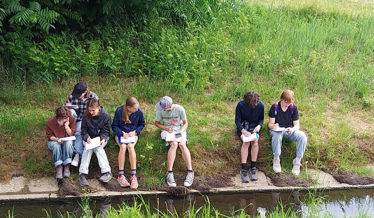 Tudi letos so dijaki prvih letnikov, tokrat 17. in 18. junija 2025, raziskovali, kako kemijski in fizikalni dejavniki vplivajo na življenje v potoku Glinščica in kako pestro je življenje na okoliških travnikih. Izmerili so hitrost vode, globino potoka in izračunali njegov pretok, pH, ugotavljali so vsebnost različnih mineralov in onesnaženost z nitriti in nitrati. Popisali so živali in rastline v potoku in s kečerjem lovili žuželke po travniku. Nabrali so tipične travniške rastline in jih določili s pomočjo slikovnih rastlinskih ključev. Z metodami proučevanja živih in neživih dejavnikov so se srečali prvič in bili so presenečeni, koliko različnih vrst živi v naši neposredni okolici in kako močno neživi dejavniki vplivajo na življenje. Naravoslovni dan je lahko tudi zabaven, če je lep dan in prijetna okolica ob potoku. Tole se je slišalo od učiteljev kemije, biologije in fizike: »Kdo bo obul gumijaste škornje in z vodno mrežo polovil pijavke, postranice, ličinke kačjih pastirjev in morda kakšno žabo ali ribico?« »To je kečer, posebna nežna mreža, s katero v obliki osmic prečešeš travnik in poloviš kobilice, mravlje, hroščke in pajke. Kdo bo poskusil?« »Tole je komplet za določanje nitratov. Slediš navodilom, dodajaš reagente in primerjaš z znanimi vzorci. Kislost tal bomo izmerili pa kar s pH indikatorskim lističem.« »A kako bomo določili pretok? Vržeš nek plovec v potok in meriš čas, v katerem prepotuje določeno razdaljo. Potem pa korak po korak izmeriš globino potoka, da dobiš prerez struge. In vstaviš v formulo.« Besedilo in fotografije: Maruša Sotler Wedam