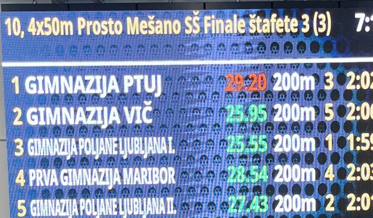 Naši dijaki in dijakinje so na državnem prvestvu v plavanju dosegli naslednje rezultate: ŠTAFETA GIMNAZIJE POLJANE 1 (Mark Frolov, Brina Rogelj, Nika Krenn Bukovec in Enej Mešič) - 1. MESTO ŠTAFETA GIMNAZIJA POLJANE 2 (Mark Milosavljevič, Ana Apat, Marta Arko in Tim Gregor Škulj) - 2. MESTO Mark Frolov - 1. MESTO neregistrirani plavalciMarta Arko - 5. MESTO registrirane plavalke Za dosežene rezultate čestitamo vsem tekmovalcem! Besedilo: Jan Jerebe, prof.