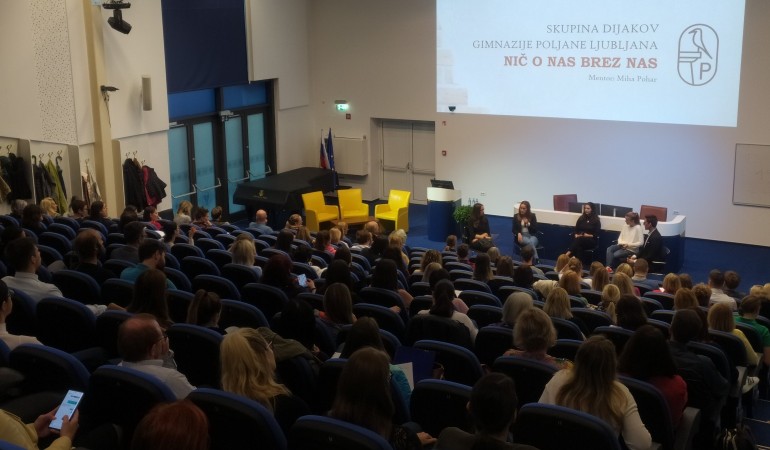 11. 2022 je v prostorih Zdravniške zbornice Slovenije v Ljubljani v organizaciji Nacionalnega inštituta za javno zdravje potekala konferenca z naslovom Kaj družba daje mladim? Konferenca je bila namenjena zdravnikom, pedagogom in socialnim delavcem iz cele Slovenije, kot posebni gostje so bili nanjo povabljeni tudi dijaki Gimnazije Poljane Nina Brugger, Brina Gramc, Ruben Košuta, Pija Pust in Tara Rubinić (vsi 4. A).Konferenca je izpostavila nekatera vprašanja o premagovanju stresa med mladimi in njihovem odnosu do dovoljenih in nedovoljenih substanc. Nina, Brina, Ruben, Pija in Tara so otvorili konferenco z okroglo mizo, poimenovano Nič o nas brez nas, na kateri so se med seboj pogovarjali o lastnih doživljanjih koronskega in postkoronskega časa ter vsakodnevnih šolskih pritiskih in tegobah, spregovorili pa so tudi o odnosu do alkohola, tobaka in marihuane. Njihova zgovornost, simpatičnost in odkritost je navdušila okrog stopetdesetglavo občinstvo. V sledečih predstavitvah so predavatelji večkrat poudarili pomembnost njihove perspektive ter dijake spraševali po mnenju, med premorom pa so mnogi poslušalci prišli izrazit pohvalo za iskrenost in zahvalo za dragocen vpogled v svet današnje srednješolske mladih. Nina, Brina, Ruben, Pija in Tara so dokazali, da so dijakinje in dijaki Gimnazije Poljane zmožni odličnega javnega nastopa, na kar smo lahko kot šola upravičeno ponosni. Na fotografijah so sodelujoči dijaki: Brina Gramc, Pija Pust, Tara Rubinić, Nina Brugger, Ruben Košuta (vsi 4. A).