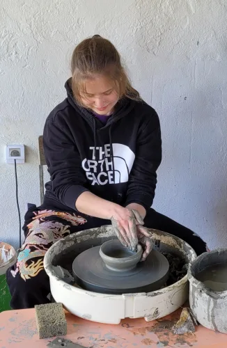 Zarja izdeluje lončeni vrč in gre ji zelo dobro.