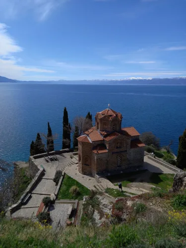 Pogled na cerkev Sv. Jovana Kanea in Ohridsko jezero.