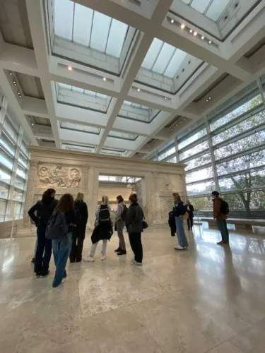 Naposled smo se preselili pred Ara pacis Augustae. Uživala sem v abstraktni beli arhitekturi stavbe, ki je poskrbela, da naša pozornost ostane na oltarju, in ga primerno razsvetljevala.