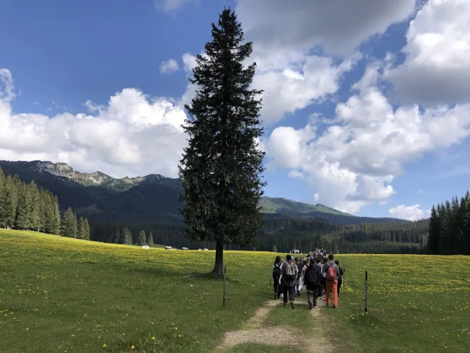 Izhodišče za Blejsko kočo je bilo pri Hotelu Šport, Pokljuka na 1300 m nadmorske višine. Pot nas je vodila skozi smrekov gozd, čez planino Zajavornik, po gozdnem vzponu do planine Lipanca, ki se nahaja na nadmorski višini 1630 m.