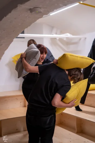 Nastopajoči v dvorani, na stopnišču, v G+: