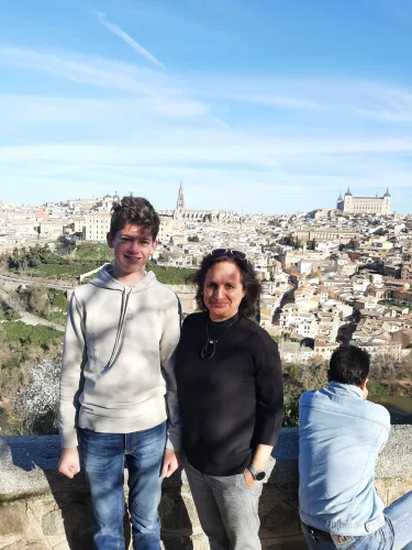 Predzadnji dan smo izkoristili za ogled Toleda. Po zajtrku nas je pred hostlom že veselo čakal Marcelino. Krmarjenje po madridskih avtocestah je kakor drvenje po serpentinastem labirintu asfaltnih pasov, ki se širijo in krčijo kot harmonika v rokah posebej navdušenega glasbenika. Vendar ne skrbite! Marcelino se je izogibal trkom kot izkušen matador, ki se izogiba jeznemu biku. Po enourni vožnji, med katero nam je Tilen razlagal tudi o oglasnih panojih v obliki bikov in vinskih kleteh, smo končno prispeli v Toledo. Najprej smo se ustavili na razgledni točki Mirador del Valle, kjer smo videli veličastno silhueto starodavnega mesta Toleda z visokimi zvoniki katedral in preperelimi zidovi srednjeveških utrdb. Spodaj se je skozi pokrajino vila reka Tejo in oddajala lesketajoč odsev zlatega sonca. Po tem, ko smo vsi shranili ta osupljivi razgled v spomin svojih telefonov, smo z avtobusom nadaljevali pot do vznožja Toleda. Tam smo se poslovili od Marcelina in Tilnu sledili po kot jara kača dolgih tekočih stopnicah do vrha hriba. Na našo žalost so bile Tilnu tekoče stopnice prepočasne in se je odločil po njih hoditi, mi pa smo morali pohiteti za njim. Profesorji so nam na vrhu velikodušno dovolili, da si vzamemo slabo uro za hitro kavico, churrose in obisk stranišča. Nato smo nadaljevali pot do katedrale Santa Iglesia, kjer se je Tilen skušal po svojih najboljših močeh pogajati z Antoniom za skupinski popust. Antonio se kot pravi katedralski varnostnik ni dal, a je povedal, da je za mladoletne vstopnica 4 € cenejša in da si lahko nekaj ulic naprej zastonj ogledamo izdelovanje nakita. Čez labirint ulic smo se odpravili do samostana Monasterio de San Juan, a ker je bila tudi tu vstopnina, smo se raje sprehodili do ene glavnih uličic s trgovinicami. Tam smo se smeli po mestu zgubljati sami. V zameno nas je nekaj srečnic dobilo nalogo, da napišemo to poročilo po prihodu v Ljubljano. Na voljo smo imeli dobri dve uri za tavanje po ulicah, ki so si bile zelo podobne. Lahko smo si kupili Toledov znameniti marcipan ali pa nakit. Če se boste kdaj ustavili v Toledu, priporočamo, da obiščete trgovinico s prigrizki Bocatería Toletanos. Tam imajo namreč slastno hrano in prijazno postrežbo. Če boste kupovali nakit, pa ne kupite takoj ogrlice za 30 €, ampak raje pojdite po ulicah z manj gneče, kjer najdete enako za 6 €. Utrujeni smo se odpravili proti avtobusu čez most Puente de Alcántara, kjer smo se po nekaj minutah na soncu razveselili starega prijatelja Marcelina. Žal nam je za zip-line čez reko, za katerega je zmanjkalo časa. No, ne čisto vsem. 😊 Po ogledu mesta je bilo pred nami posebno srečanje: obisk slovenskega veleposlanika v Španiji. Po uri utrujene tišine na avtobusu in manjšem postanku v trgovskem centru El Corte Inglés, nas je veleposlanik Robert Krmelj toplo sprejel v svoji rezidenci. Naredili smo lepo skupinsko fotografijo in imeli priložnost izvedeti marsikaj zanimivega o slovenski diplomaciji in zunanji politiki, o delu in življenju v Španiji. Nekateri so še naprej kramljali z veleposlanikom, drugi pa smo se veselili prigrizkov, ki so jih velikodušno priskrbeli sestradanim najstnikom. Po dolgo pričakovani večerji so nas profesorji zbrali v spodnjih prostorih hostla ter preizkusili naše pridobljeno znanje s pomočjo spletnega kviza Kahoot. Z vprašanji so preverjali: ali ima Madrid najstarejšo restavracijo na svetu, zakaj je koloseju ime Las Ventas, zemljepisno lego Madrida in še mnogo kaj. Tekmovali smo v parih, zmagovalca (iz 1. letnika 😊) si bosta lahko razdelila bon za potovanje z agencijo Trud, ki nas je tudi pripeljala v Madrid.