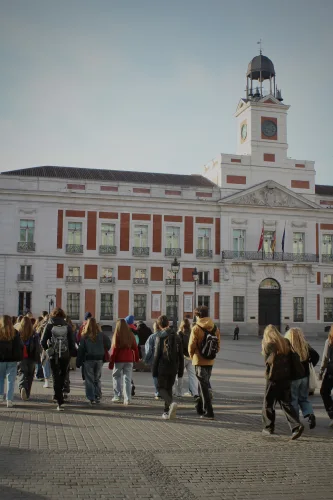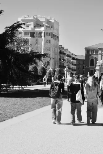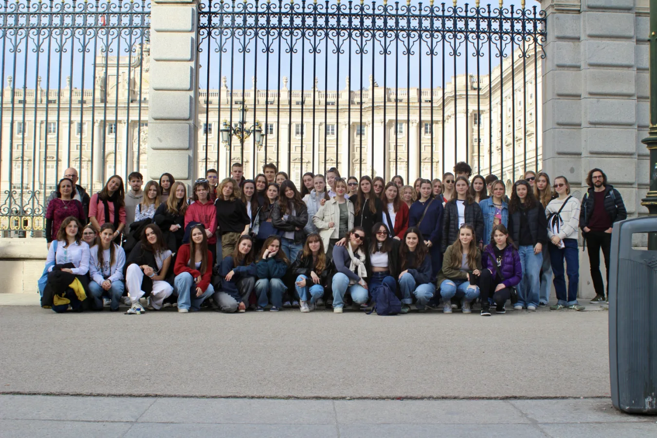 Na poti do letališča smo zapeli še rojstnodnevno “Vse najboljše” sošolki in tudi nekajkrat zavriskali v slovo vozniku Marcelinu. S kartami smo še zadnjič šli skozi varnostno preverjanje letališča in si oddahnili, da letos nihče ni izgubil osebnega dokumenta. Utrujeni smo večino leta domov prespali. Pristali smo v Benetkah, kjer nas je znova pričakal voznik Franc Grčar. Na avtobusu smo ob polnoči zapeli še enemu rojstnodnevnemu slavljencu. Vožnjo do Ljubljane nas je večina preživela s slušalkami na ušesih in v srcih s sladko-grenko bolečino konca potovanja. Brezskrbni dnevi raziskovanja in pustolovščin so se umikali vsakdanjemu ritmu življenja, živahnost dopusta pa je bledela v enobarvno monotonijo rutine. In vendar se je sredi žalosti odhoda znašel kanček upanja – obljuba prihodnjih dogodivščin, ki čakajo na obzorju kot svetilnik v temi. Učenje. Ob treh zjutraj smo na parkirišču Dolgega mostu spet srečali starše. Poslovili smo se od profesorjev, ki so nam lepšali trenutke v Madridu, od vodiča Tilna, zaradi katerega nismo nikogar izgubili v množičnih ulicah, in, seveda, od voznika Franca, ki nam je omogočil varno in hitro pot domov. Tik preden smo se razkropili, nas je profesorica Natali še enkrat spomnila, da napišemo ta prispevek. Upamo, da ste s pomočjo tega članka lahko podoživeli naš izlet!