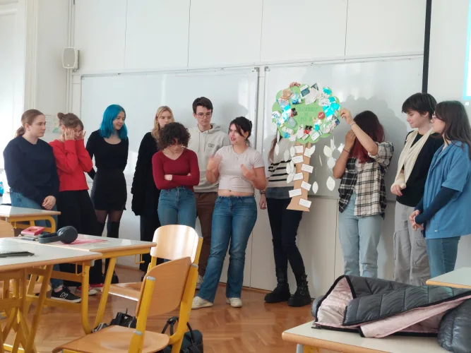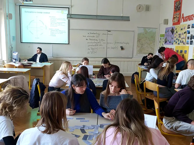 Projektni dan v 3.H je bil posvečen poglobljenemu razmišljanju o sprejemanju odgovornih odločitvah in razvoju moralne občutljivosti. Dijaki so zbrali dragocena spoznanja, ki so jih pridobili skozi analizo besedil, sodelovalnih kart in kartic vrednot. V skupinah so se soočili z realnimi moralnimi dilemami, raziskovali Schwartzovo teorijo vrednot in razvijali kritično razmišljanje. Posebnost dne je bila prevajanje teoretičnih konceptov o odgovornosti, kot so odgovornost, biti odgovoren, prevzeti odgovornost, svobodne izbire in posledice dejanj, v nemščino. Največji dosežek projektnega dne je bil prepoznavanje kompleksnosti odgovornosti v različnih socialnih vlogah in kontekstih. Ozavestili smo, da nas v odgovorno vedenje vedno poganjajo vrednote, ki jim sledimo in so nam pomembne. Učitelja sva bila pozitivno presenečena nad dijaškimi sposobnostmi večplastne analize in razumevanja difuzije odgovornosti. Projekt je tako pripomogel k razvoju veščin moralnega razmišljanja, ki bodo dijake spremljale v vsakdanjem življenju.