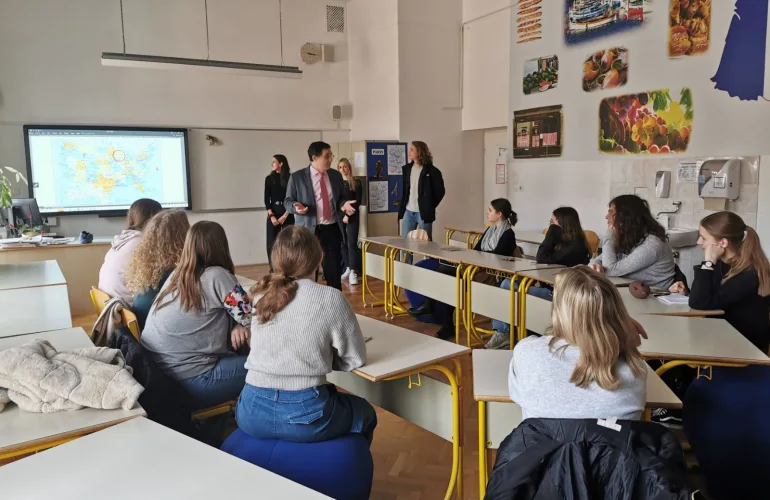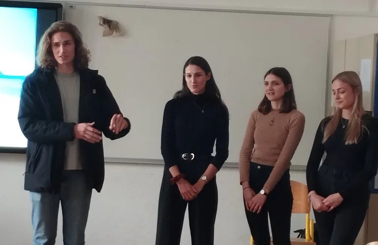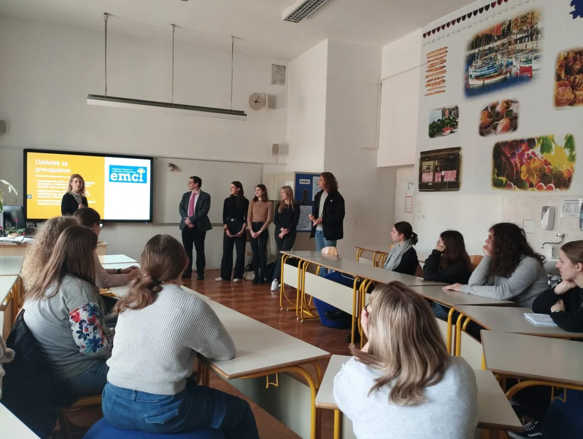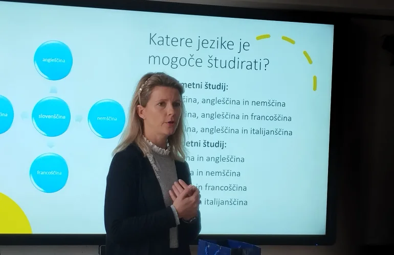 Nazaj12. marca 2024 so nas na Gimnaziji Poljane obiskali gostje s Prevajalskega oddelka ljubljanske Filozofske fakultete. Dr. Adriana Mezeg, dr. Donald Francis Reindl in štirje študentje so predstavili specifike programa in poklica prevajalec oziroma tolmač. Izpostavili so dinamičnost študijskega programa, ki vključuje veliko projektnega dela, prakse, stika z bodočimi delodajalci, mednarodnih študijskih izmenjav in na koncu mednarodno diplomo, ki jo diplomanti napišejo v sodelovanju s francosko ali avstrijsko univerzo.