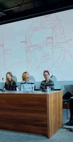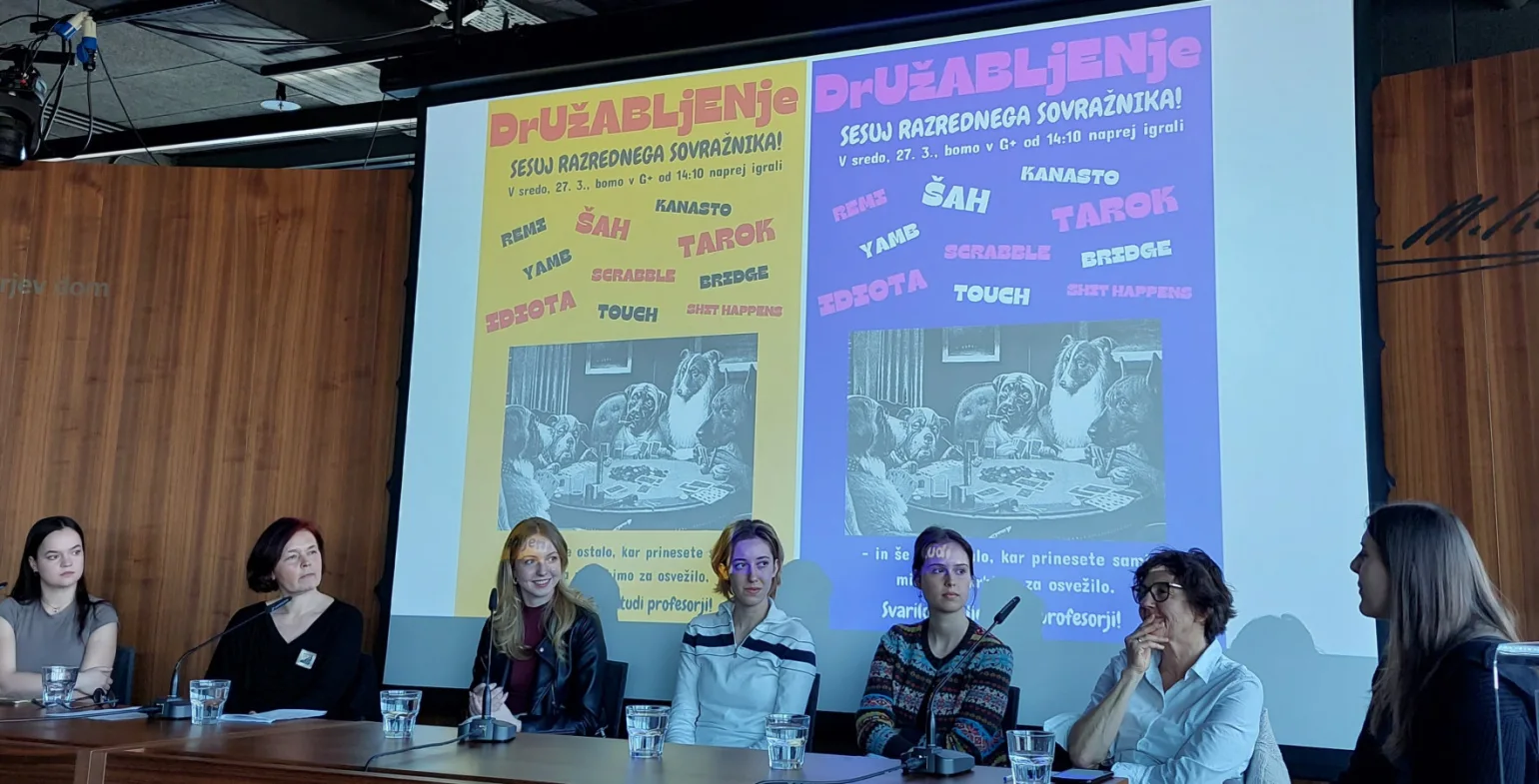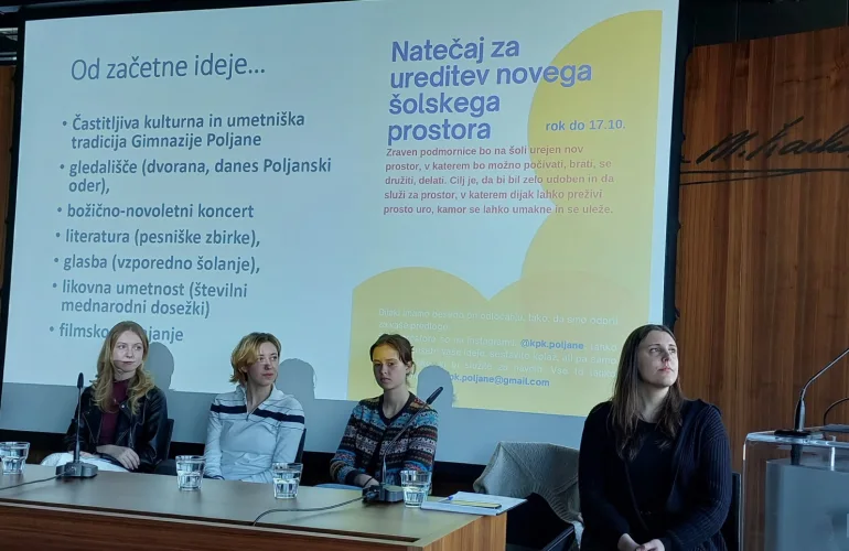 V pogovoru na temo Prostori ustvarjalnosti mladih sta sodelovali poljanski dijakinji Naša Kolenik in Mija Fatur Škof ter profesorica Nina Ostan. Predstavile so večleten proces nastajanja prostora, v katerega so bili intenzivno vključeni dijakinje in dijaki ter tudi dejavnosti, prireditve, razstave… ki se v prostorih odvijajo. Razgrnile so načrte za prihodnje in povedale, kaj jim G+ pomeni ter kako je na šoli zaživel.