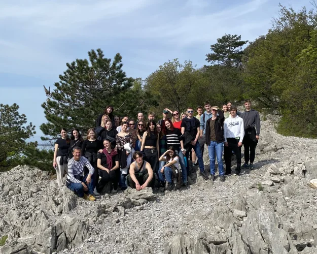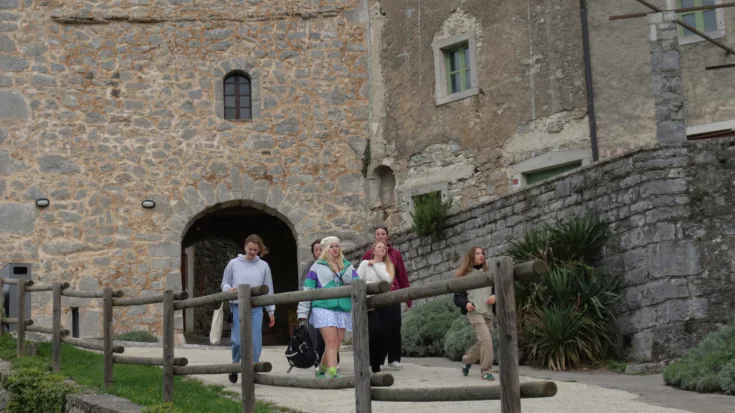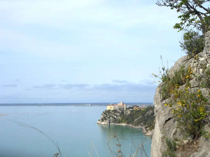Še preden je uspel svoje zakikirikati petelin, je naše speče gnezdo dijakov prebudil eden od skrbnih profesorjev, z zgolj z najboljšimi nameni. Do hiše, kjer nas je čakal prvi obrok, smo se že povsem samozavestno povzpeli skozi našo vasico, naslonjeno na strm hrib. Po mahovnatih potkah so nas noge nesle mimo majhnih dvorišč, pisanih vrtov in raznolikih hiš, skoraj brez pomanjkljivosti v orientaciji in odkrivanju bližnjic. Glede priprave zajtrka smo bili sicer naknadno prepuščeni sami sebi, a smo se kljub temu izvrstno znašli. Kaj kmalu je vendarle zadišalo po močni (mačji?) kavi. Sledilo je kotaljenje v dolino in passegiata po slikovitih vijugah Rilkejeve poti. Črke Rilkejeve poezije so se zmešale s slanim morskim zrakom, ki nam je sledil vso pot do Trsta. Sprehodili smo se proti Narodnem domu. Tam smo tako rekoč odpotovali v preteklost Trsta, kjer so tik pred našimi očmi plameni oblizovali zidove veličastne zgradbe. Skozi zgodbe smo izvedeli, kako neprecenljiv je ta delček zgodovine zamejskih Slovencev za italijansko mejo.