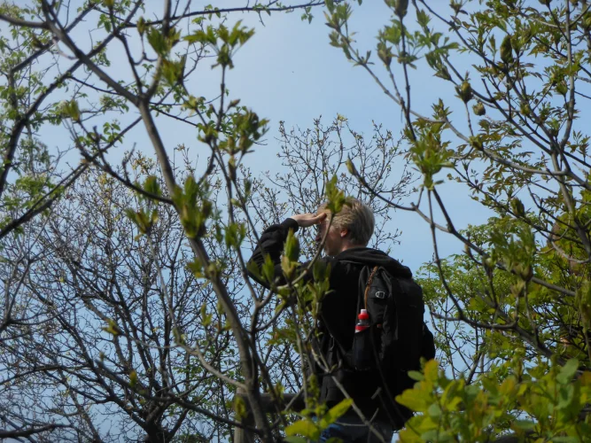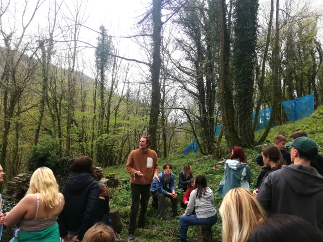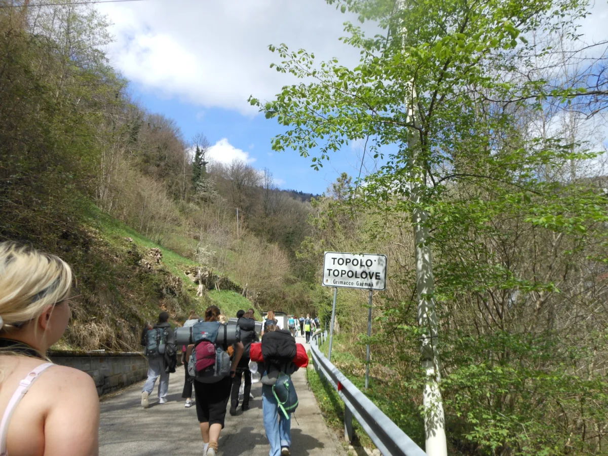Naslednji dan smo zapustili meje Slovenije in se zazrli skozi Slovensko multimedijsko okno ali SMO. Opazovali smo razpletanje klobčiča zgodovine zamejskih Slovencev v Italiji vse do današnjih dni. Kot nalašč za pohod do naše naslednje postojanke, drobcene vasi s povsem svojim ritmom življenja, smo se pred vzponom znašli z nekaj zamude. Na srečo nam v spokojnem gozdu, ki objema ta skrivnosten kraj, niso grozile neopravičene ure. Po mnogih ovinkih, a neutrudnih korakih, se je pred nami končno zarisala vasica, ki ji bomo kljub mnogim oblikam imena na krajevni tabli, najnatančneje rekli kar Topoluove, oziroma Topolovo. Naselje šteje le pičlih petindvajset prebivalcev, kar je pomenilo, da smo z invazijo poljanskih dijakov za skoraj cel dan predstavljali večinsko prebivalstvo. V umetniški vasici deluje nadvse zanimivo Kulturno društvo Robida, ki igra pomembno vlogo pri ohranitvi kulture in jezika krajev, kot je ta. Izdajajo časopis, v preteklosti so organizirali srečanja predstavnikov različnih kultur, ujamemo pa jih lahko tudi na radijskih frekvencah. Zahvaljujoč profesorju Skrbinšku, smo spoznali od bliže, prenočili smo namreč prav v umetniški rezidenci. V drobni, vegasti hišici smo si postlali kar na tleh. Končno nam je naša (pretežka) oprema prišla prav. Pred nadvse zanimivo večerjo, pri kateri nismo pogrešali barvitih cvetic, klorofila ali slastnih grižljajev, smo se podali v hosto, kjer smo svoj rastlinski plen tudi nabrali. Za to je v veliki večini poskrbel kar profesor, ki premore znanje o divjih rastlinah. Njemu gre tudi zahvala, da smo se po prej omenjeni večerji, brez posledic na želodcu, vrnili do naše hiše, kjer nas je čakal še en krajši izlet. Tokrat smo se v filmu z naslovom Zgodbe iz kostanjevih gozdov, kljub zapirajočim se očem, srečali z otožno usodo takšnih osamljenih, a edinstvenih kotičkov sveta. V nekolikanj natrpani sobici smo se naposled le udobno zabubili v spalnih vrečah. Čakala nas je le še izkušnja bližnjega srečanja s škorpijonom, kar je za našo zgodbo morda precej odvečen podatek. Pravzaprav pa je prav ta tisti, ki nas je spomnil, da je tisto noč nad nami res ostalo skoraj le nebo.