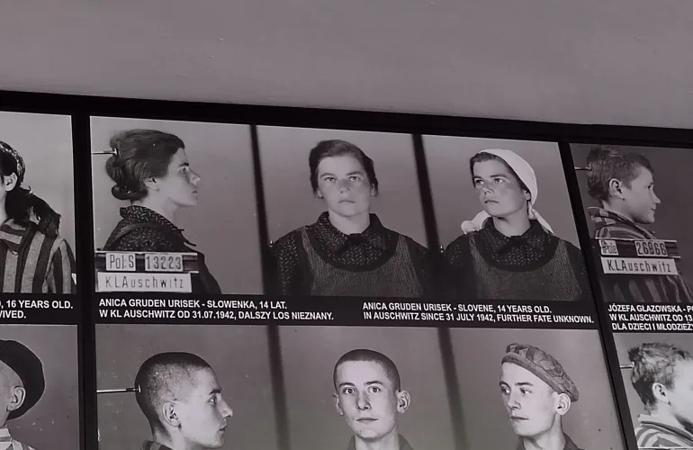 Vstopaš v barake in poskušaš doumeti, koliko oseb se skriva v ogromnih kupih las, čevljev, loncev, otroških oblek, po hodnikih portretov zapornic in zapornikov, pa ne moreš.