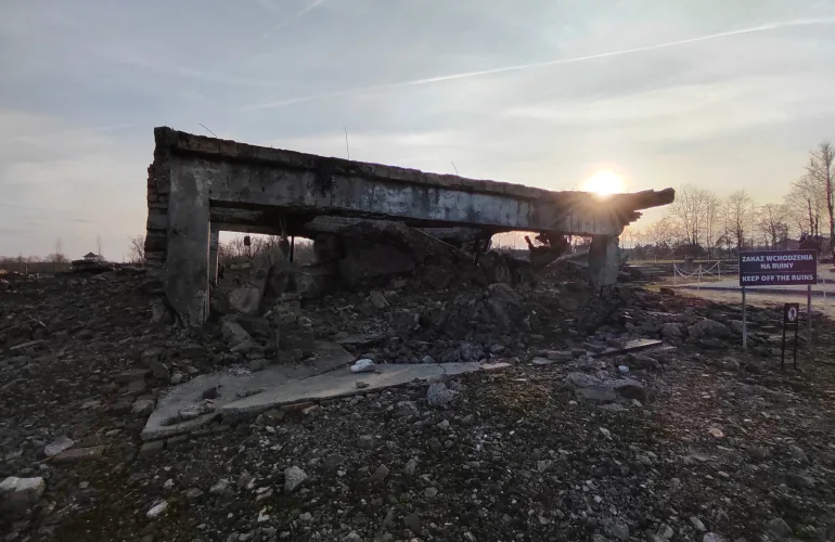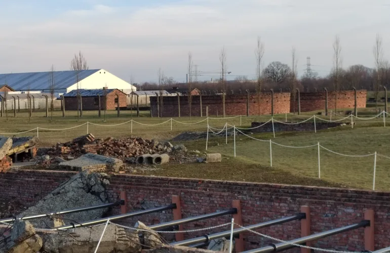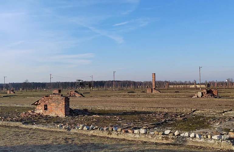 In Birkenau. Pogled na obsežno ravnino, presekano s tračnicami, iz nje v zrak režejo preostali dimniki barak in ruševine krematorijev. V daljavi grozeča ograja in za njo grozeči gozd poljskih dreves. Poskušaš si predstavljati, kako je tu bilo nekoč, pa ne moreš, le strmiš in molčiš. Tu si šest ur in hvaležen si, da le toliko.