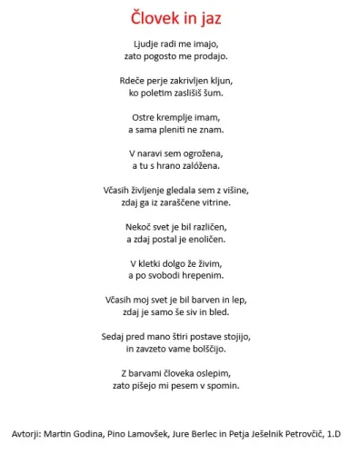 Vsi dijaki so bili tudi zelo kreativni, saj so se dokazali v pisanju različnih, živalsko obarvanih, literarnih zvrsti. Spodaj je pesem, ki so jo napisali dijaki Petja, Jure, Pino in Martin.