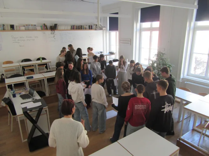 Projektni dan je potekal na podlagi prebranega romana Liu Zakrajšek Zajtrk prvakinj. Dijake smo želeli opozoriti na družbeno problematiko (prekarnost, podnajemništvo, stiske mladih, medčloveške odnose), izpostavljeno v prebranem romanu. V prvem delu so dijaki po skupinah na podlagi odlomkov sami prepoznavali tematike, v nadaljevanju pa so se o romanu pogovarjali z avtorico.