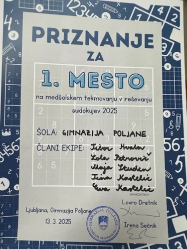 NazajV četrtek, 13. 3. 2025, je na naši šoli potekalo medšolsko tekmovanje ljubljanskih srednjih šol v reševanju Sudokuja. S tem smo obeležili svetovni dan matematike, ki je vsako leto 14. marca.
