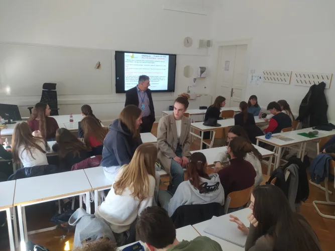 (Slika prikazuje dijake med delom v skupinah - pogovarjali so se o delovanju nuklearke, prednostih in negativnih plateh jedrske energije in mnenju o izgradnji novega bloka JEK.)