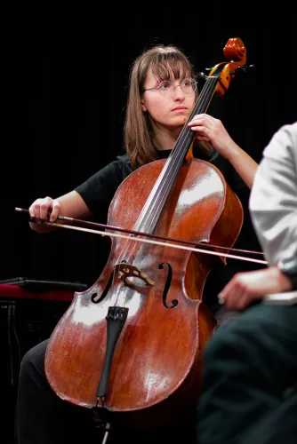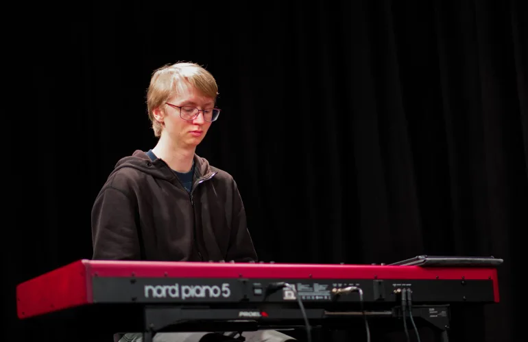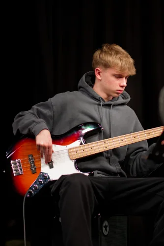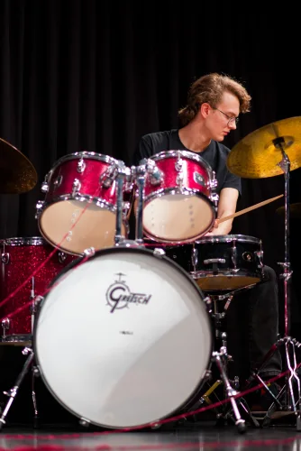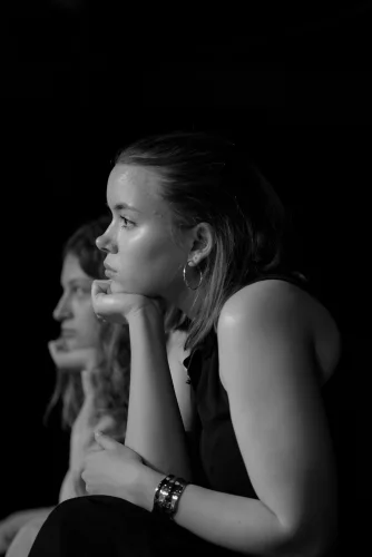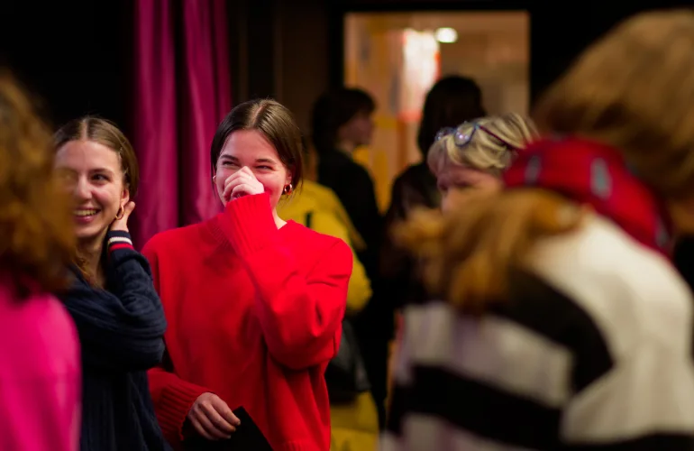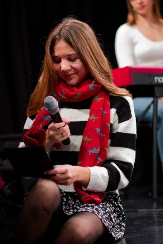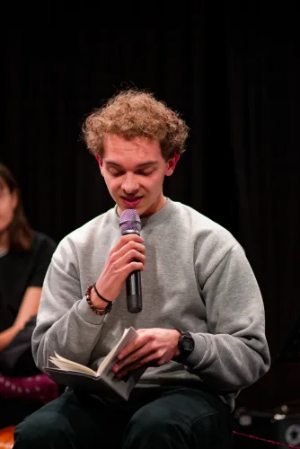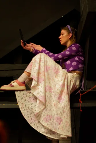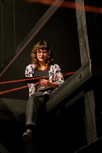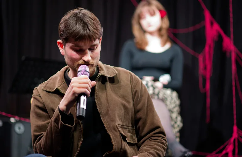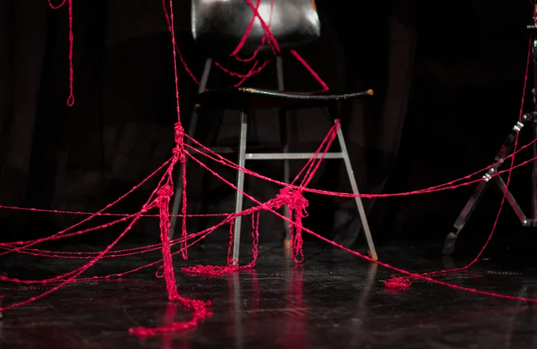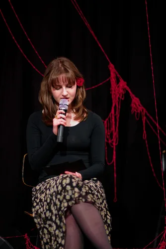 Vzdolž odra, katerega sleherni kotiček so zasedali bralci, vsak na svojem prav posebnem sedišču, so se odkotalili klobčiči rdeče volne. Zavoljo glasbene spremljave so tudi glasbeniki (čelistka in pianista) strune svojih inštrumentov za ta večer obarvali rdeče. Besede so odzvanjale še iznad glav gledalcev. Namesto na stole, so se namreč nekateri dijaki posedli po vejah tramov visoke dvoranske krošnje. Njeno senco je v večeru zapustil tudi profesor Skrbinšek, ki je z nami delil cvetice svojega ustvarjanja in pesmi izpod svojega peresa.