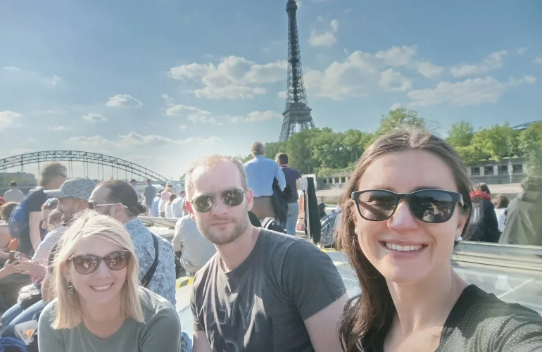 Po kosilu smo se z metrojem odpeljali pred Eifflov stolp. Vendar še nismo bili pripravljeni na vzpon, prej smo se namreč namenili malce nižje, do barčice, s katero smo odrinili na plovbo po Seni, od koder smo videli, poleg Eifflovega stolpa, še katedralo Notre Dame, najstarejši pariški most, most Alexandre III.