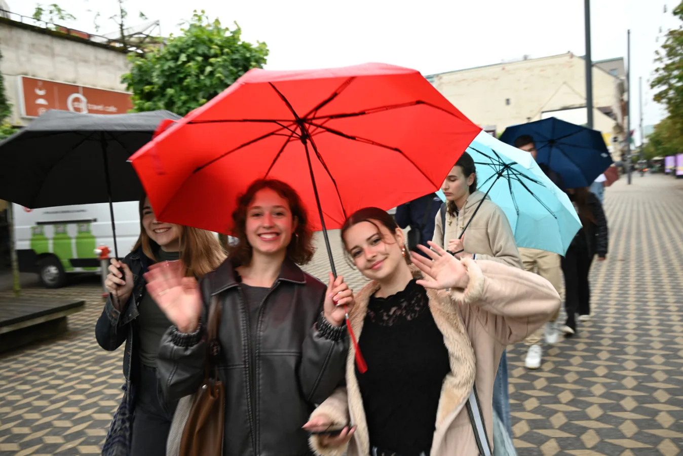 Kljub dežju, ki je spremljal dobršen delež obiska naših makedonskih prijateljev, smo skozi gnečo dežnikov kmalu prepoznali obraze naših gostov. A tudi naporna večurna vožnja ne premore te moči, da bi iz njihovih obrazov izbrisala igrive nasmeške, svetlejše od sonca na njihovi zastavi.