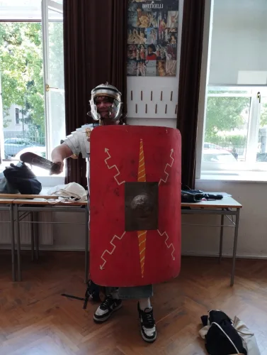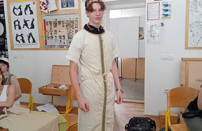 Drugi arheološki dan so dijaki raziskovali Emono, spoznavali rimske napise v lapidariju Narodnega muzeja in materialno dediščino, ki sta jim jo predstavila člana društva Herodot kar v prostorih naše šole: dijaki so si lahko oblekli toge (če so jim seveda pomagali sošolci, »sužnji«), nadeli rimski nakit, poskusili pa so tudi legionarjevo opremo in ugotovili, da so morali biti tile rimski legionarji pravi silaki.