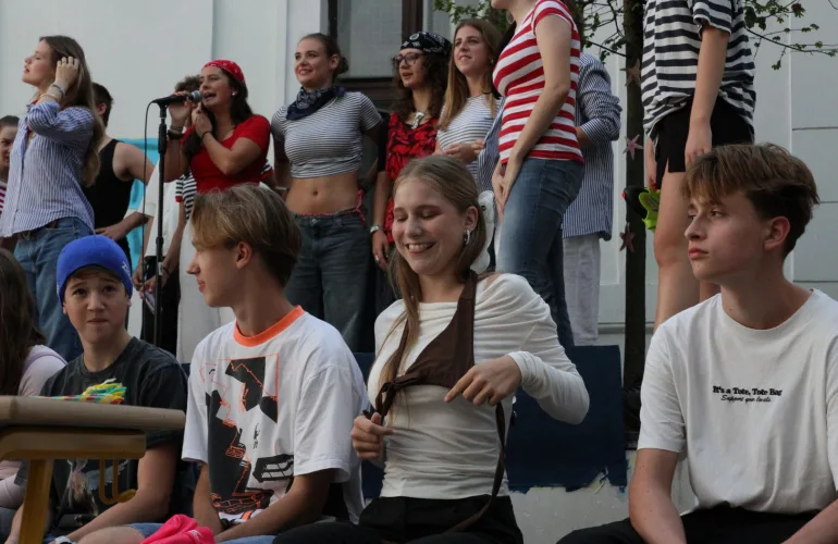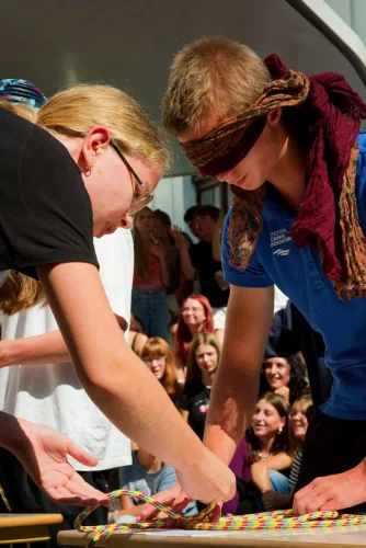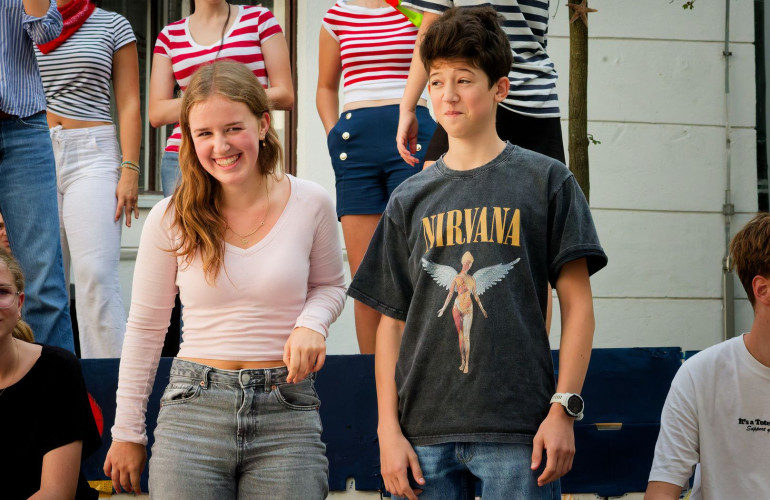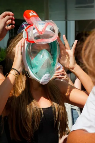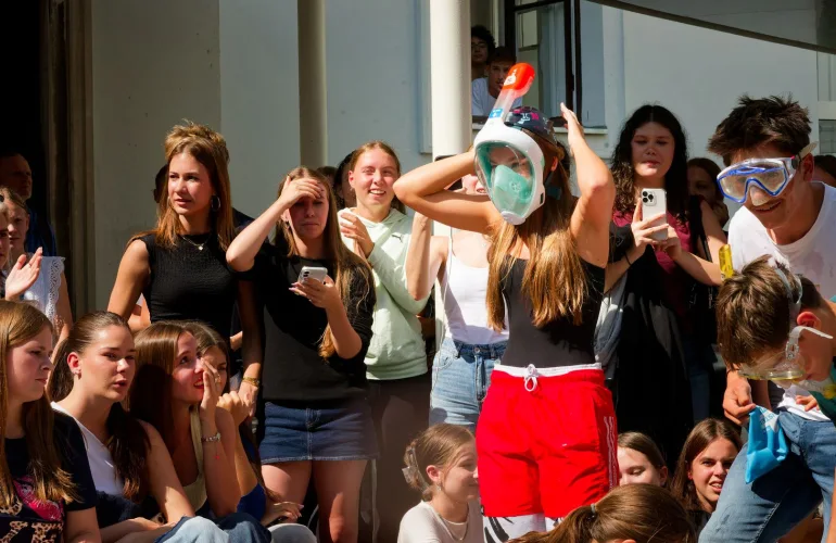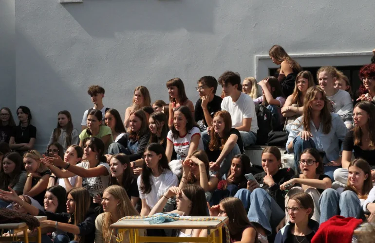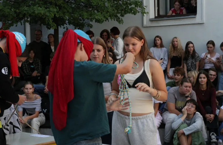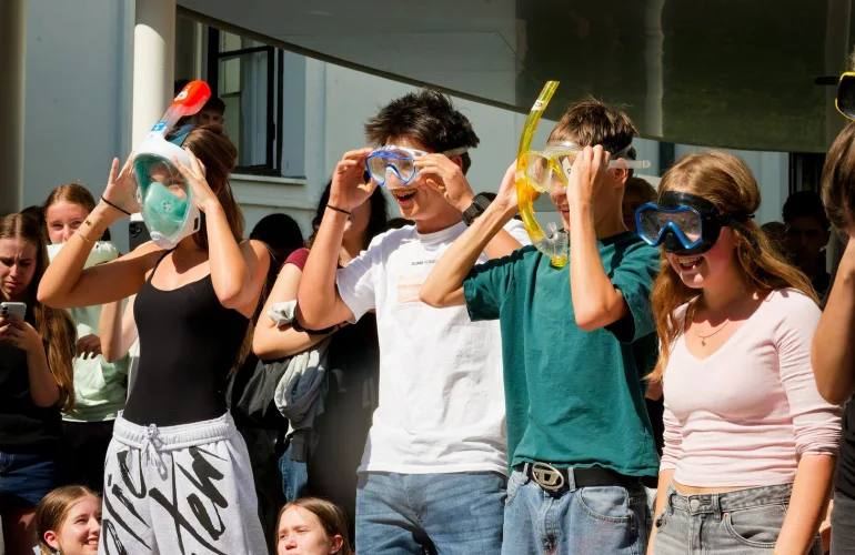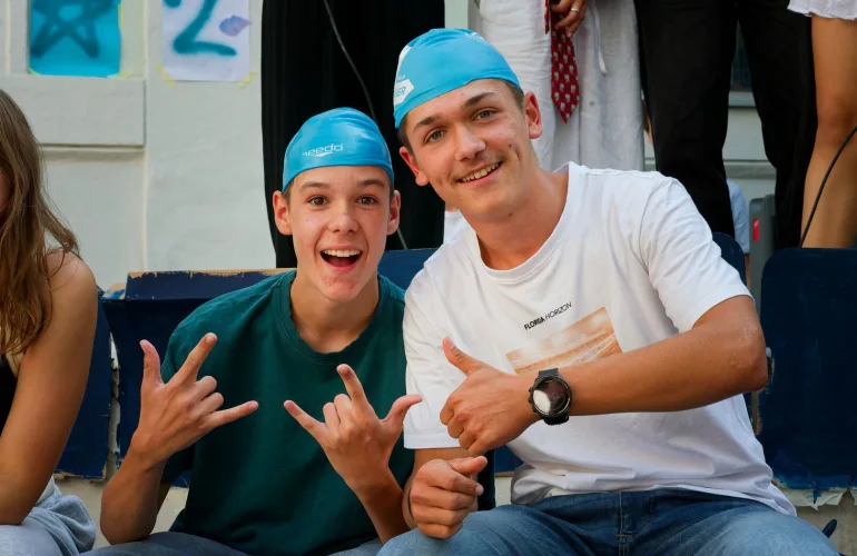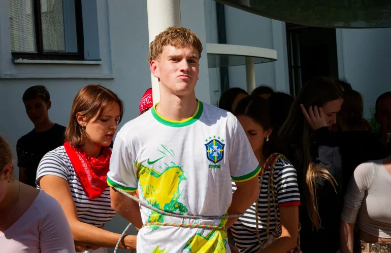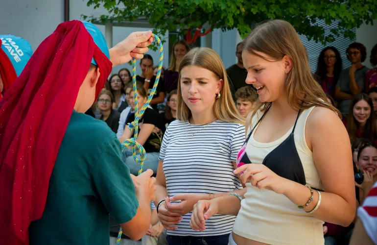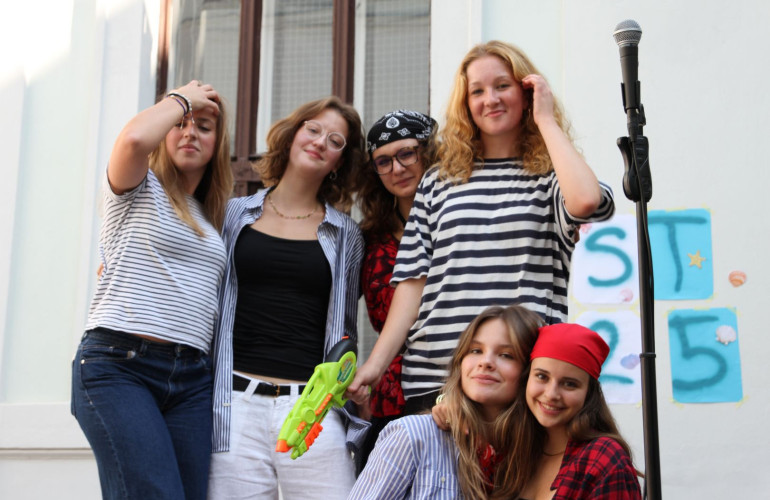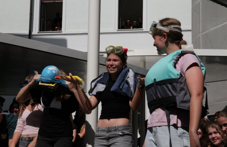 Dijakinje 4.c, 4.d, 4.e, 4.f in 4.g razreda smo pripravile zabaven program in izbrale še poletno temo – mornarstvo – v okviru katere smo si zamislile šest izzivov, pri katerih sta sodelovala predstavnika vsakega razreda prvih letnikov.