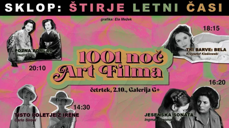 NazajV četrtek, 2. 10., se bo v galeriji G+ odvilo filmsko popoldne, ki se bo prevesilo v filmski večer. Izbor štirih filmov se pokriva s konceptom štirih letnih časov. Pridite in si oglejte kak film, ure začetka projekcij so natančno določene.