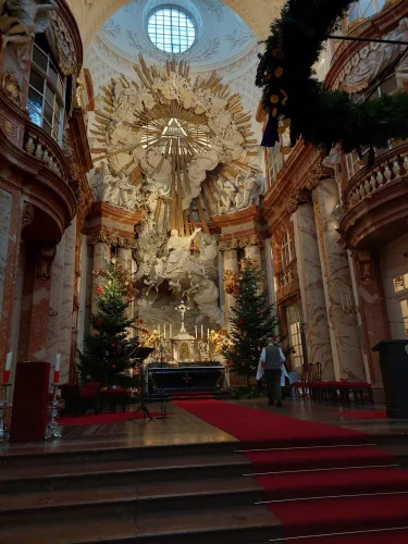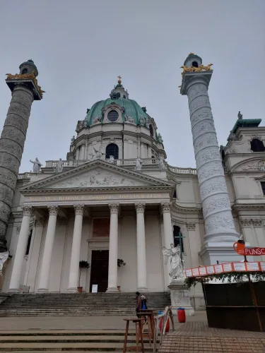 Po dolgi vožnji smo prispeli na cilj in najprej sem opazila gosto meglo, ki je ovijala mesto. Izstopili smo na Karlovem trgu in se sprehodili do Karlove cerkve. S svojo mogočnostjo se dviga visoko v zrak. Cerkev je bila začasno zaprta, zato smo morali na njen ogled počakati skupaj z ostalimi turisti, ki so neučakano stali v vrsti. Najbolj me je navdušila notranjost cerkve, saj je bila bogato okrašena v baročnem slogu. Ko sem se ozrla navzgor, sem na stropu zagledala pretresljivo fresko, ki prikazuje svetnika Karla, ki Boga prosi, naj Dunaj odreši kuge, okoli njega pa so upodobljeni umirajoči prebivalci mesta. Cerkev je dal zgraditi cesar Karl VI., potem ko se je Dunaj rešil kuge. Nato smo se po strmih in zavitih stopnicah povzpeli na teraso, s katere se nam je kljub megli odprl lep razgled na Dunaj. Čeprav sem vedela, da je Dunaj dvomilijonsko mesto, me je vseeno presenetila njegova razsežnost.