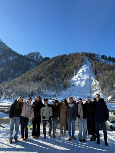 V torek smo se odpravili na zimske radosti na Jezersko. Pot je na avtobusu pospremila španska in slovenska glasba, zamudniki, natrpani v kombiju s profesorji, pa so bili deležni masaže lasišča. Preizkusili smo se v teku na smučeh, tubanju in sankanju. Vrhunec vsega je bilo kolektivno kepanje, kjer so podivjali tudi najsramežljivejši. Kot češnja na vrhu tortice pa sta nas zvečer v baru Prulček pričakali dve drag kraljici in karaoke. Sceno smo podrli dobesedno.