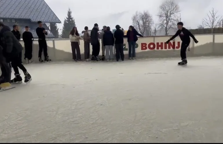 V sredo nam je spet zagodlo vreme, vendar se nam obrazi niso skisali. Odpravili smo se v Bohinj, kjer smo vedrili na drsališču in opogumljali Špance na ledu (ali obratno …), v dvorani Danica pa smo se spoprijeli še s plezalno steno. Po okrepčilu in klepetu na toplem smo z dežniki v rokah za sladico opravili še obvezen postanek na Bledu.