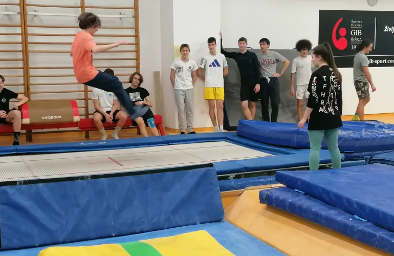 2. skupina je vadila akrobatiko na gimnastičnem orodju,