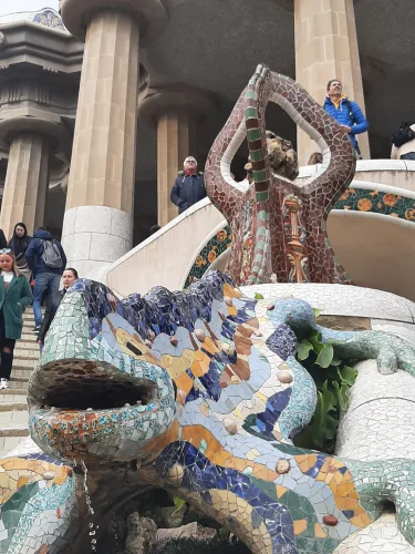 Tretji dan se je začel na znani tržnici Boqueriji, ki leži tik ob Rambli. Poskusili smo različne prigrizke, napitke, sladice, kot na primer turrón ali churrose. Ko smo se natovorili z malicami, smo se povzpeli v Park Güell, kjer smo opazovali čudovite Gaudíjeve mozaike. V napoto pa so nam bili golobi in močan veter, zaradi katerega je bilo hladno in malce neprijetno. Kljub temu smo se okrepčali in nadaljevali pot do Sagrade Familie. V njeni notranjosti smo se končno pogreli, predvsem pa so nas prevzeli čudoviti vitraži in poigravanja s svetlobo. Vodič nam je predstavil Gaudíjevo življenje in predanost gradnji te cerkve, ki je zares ena najčudovitejših na svetu. Všeč so nama bile neverjetne podrobnosti, ki krasijo celotno zgradbo.