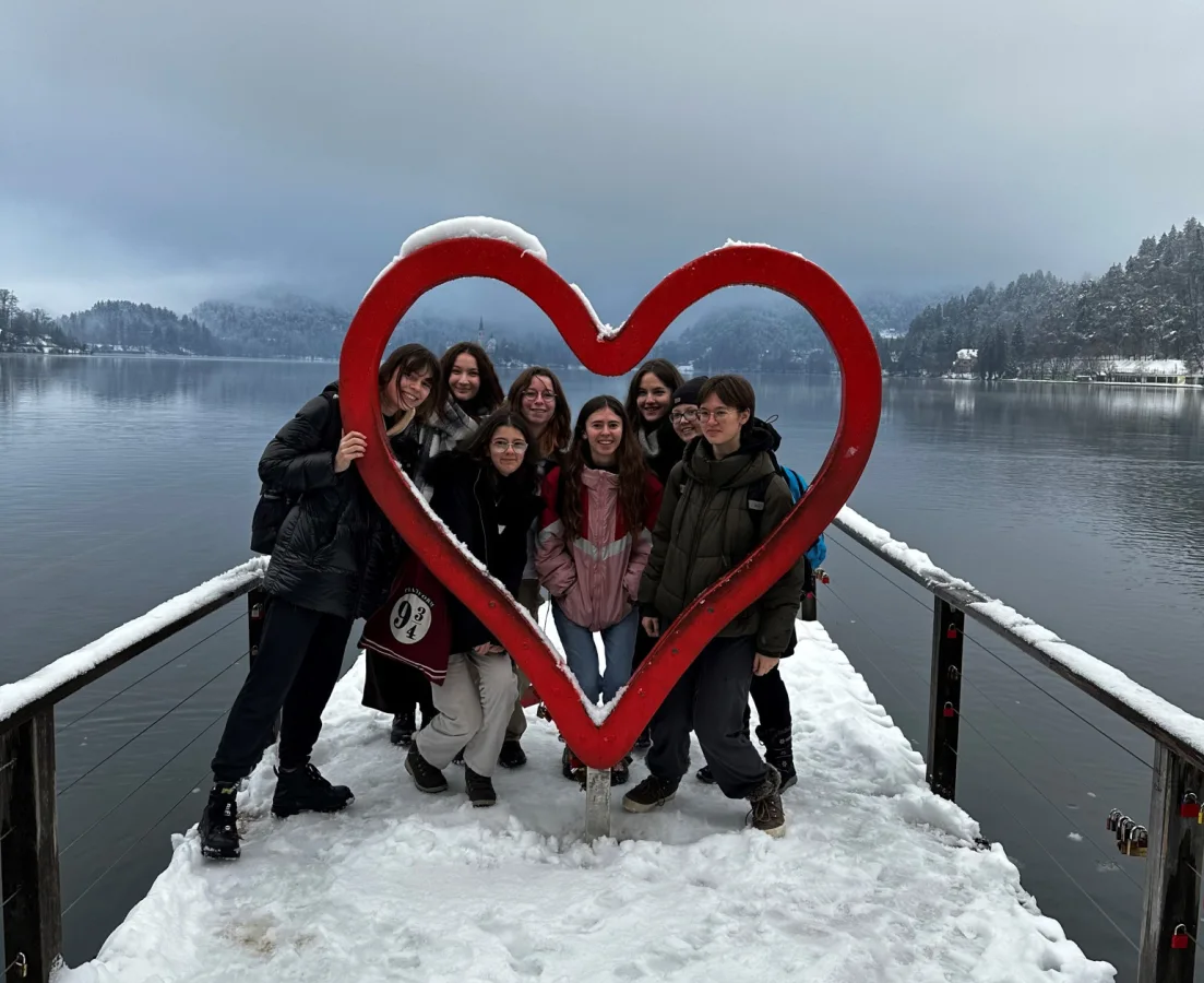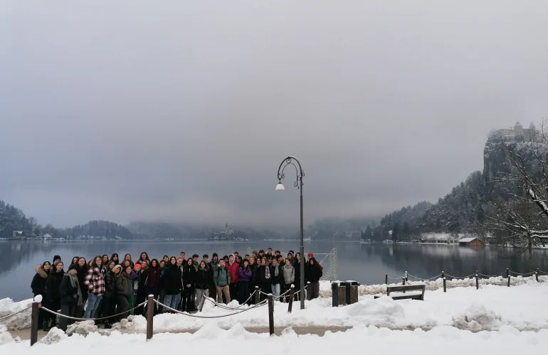 V sredo zjutraj smo se odpravili na Bled, se sprehajali okoli jezera, se kepali kot ponoreli, saj naši bretonski kolegi snega ne vidijo pogosto, in se na koncu izleta posladkali še s kremšnitami. Domov smo prišli premočeni, premraženi in do ušes nasmejani.